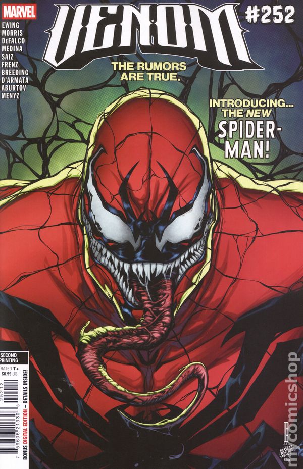 2nd Printing. (W) Al Ewing; Tom DeFalco (A) Paco Pedina; Ron Frenz (CA) David Baldeón THE RUMORS ARE TRUE! Venom has a brand-new red-and-blue suit - and a brand new name to go with it! How will the people of New York react when they find out that the city's newest Spider-Man is the SYMBIOTE they love to loathe? Luke Cage and Otto Octavius are ready to debate the matter - with their fists! PLUS: A bonus tale of the origin of an even All-NEWER Venom! AND a celebratory flashback story by the team behind the classic AMAZING SPIDER-MAN #252! 48 pages, rated T+, full color Cover price $6.99.