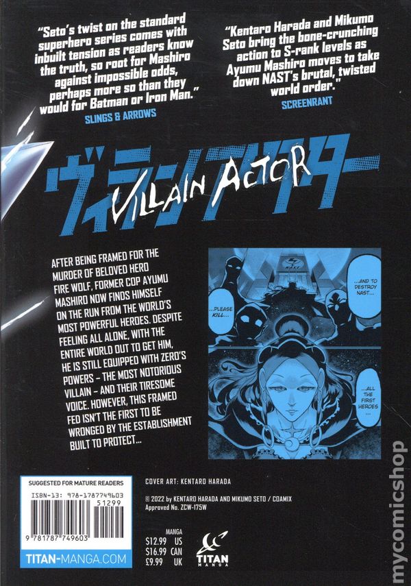 Volume 2 - 1st printing. Written by Mikumo Seto. Art and cover by Kentaro Harada. Translated by Motoko Tamamuro and Jonathan Clements. When a street-level cop inherits a villains power, the truth behind justice begins to unravel. Ayumu Mashiro, once resigned to life as an ordinary police officer, now wields the terrifying power of Zero - the most feared villain in history. A mysterious voice guides his every move as he uncovers the unsettling truth: the heroes arent who they seem. In the explosive continuation of Volume 1, Ayumu is hunted relentlessly by the worlds vaunted heroes. Softcover, 5-in. x 7-in., 176 pages, B&W. Mature Readers Cover price $12.99.