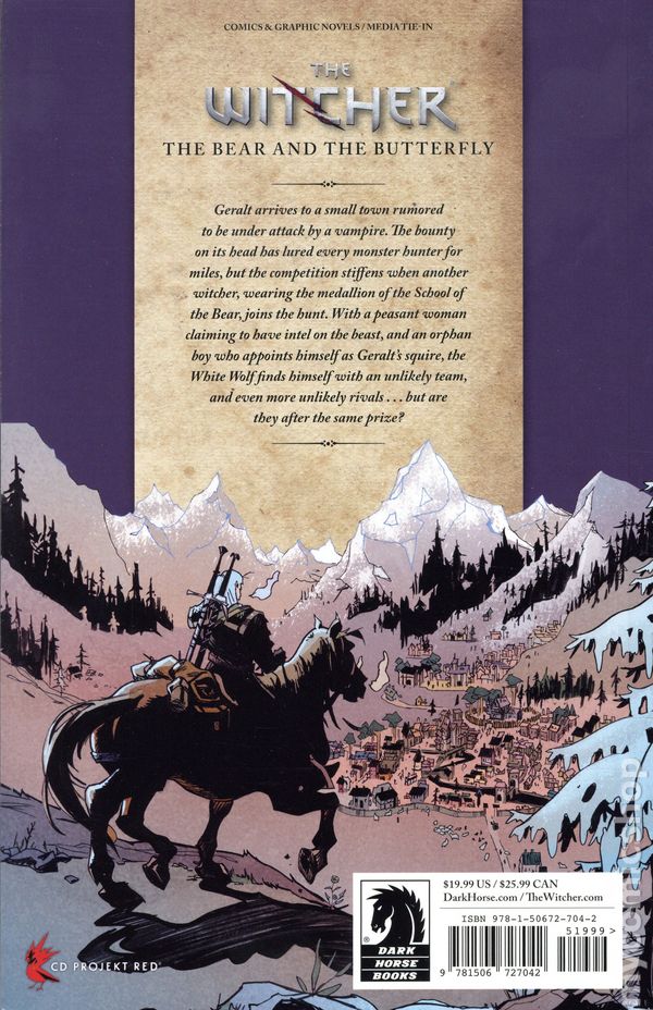 Volume 10 - 1st printing. "The Bear and the Butterfly!" Collects The Witcher: The Bear and the Butterfly (2025 Dark Horse) #1-4.Written by Simon Spurrier. Art by Stephen Green. Cover Mattie De Iulis. Back by Stephen Green. A hunt for a vampire pulls Geralt into a series of swindles, twists, and punch-ups. Geralt arrives to a small town rumored to be under attack by a vampire. The bounty on its head is substantial, drawing in every two-bit monster hunter for miles, but the competition stiffens when another Witcher, wearing the medallion from the School of the Bear, joins the hunt. Geralt is offered an advantage in the hunt by a peasant woman, but there's a catch, and a small issue of her being locked up in prison. And with an orphan boy appointing himself as Geralts squire, the White Wolf finds himself with an unlikely team, and even more unlikely rivals, but are they after the same prize? Softcover, 104 pages, full color. Cover price $19.99.
