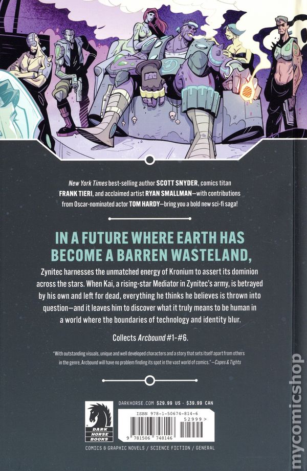 1st printing. Collects Arcbound (2024 Dark Horse) #1-6. Written by Scott Snyder and Frank Tieri. Art and cover by Ryan Smallman. New York Times-bestselling author SCOTT SNYDER and comics titan FRANK TIERI join forces with acclaimed artist RYAN SMALLMAN and Oscar-nominated actor TOM HARDY to bring you a bold new sci-fi saga! In a future where Earth has become a barren wasteland, Zynitec harnesses the unmatched energy of Kronium to assert its dominion across the stars. When Kai, a rising star Mediator in Zynitecs army, is betrayed by his own and left for dead, everything he thinks he believes is thrown into question—and leaves him to discover what it truly means to be human in a world where the boundaries of technology and identity blur. Hardcover, 168 pages, full color. Rated T+ Cover price $29.99.