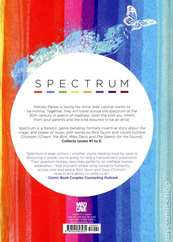1st printing. Collects Spectrum (2024 Mad Cave) #1-6. Written by Rick Quinn. Art and Cover by Dave Chisholm. Melody Parker is losing her mind. Ada Latimer wants to be normal. Together, they will travel across the spectrum of the 20th century in search of madness: both the kind you inherit from your parents and the kind required to be an artist. Spectrum is a frenetic, genre-blending, formally inventive story about the magic and power of music with words by Rick Quinn and visuals by Dave Chisholm(Chasin The Bird, Miles Davis and The Search for the Sound). Hardcover, 176 pages, full color. Teen+ Cover price $39.99.
