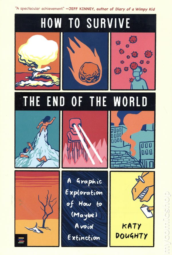 1st printing. Story and art by Katy Doughty. In a full-color debut, a graphic novelist takes an engrossing, gleefully existential deep dive into the many ways that humanity could—and almost did—meet its end. Since 99.9 percent of all species that have lived are extinct, its bound to be our turn eventually, right? So whats most likely to kill us? A well-timed asteroid? Some new robot overlords? With wit and dry humor, debut graphic novelist Katy Doughty blends science and history to explore our chances of surviving disasters such as plagues, global warming, and alien invasion. Drawing on interviews with experts in fields like infectious diseases, AI, and interplanetary exploration, she combines cutting-edge research with compelling visuals: mugshots of the deadliest microbes, graphs of the winners and losers of mass extinction events, and a whole lot of dinosaur drawings. For apocalypse aficionados, the morbidly curious, and the just plain curious, this is your antidote to existential dread—a timely, imaginative, and ultimately hopeful take on humankinds ability to survive the odds. Hardcover, 6-in.x 9-in., 256 pages, full color. Age 14 and up Cover price $24.99.