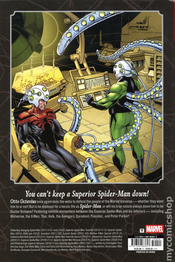 1st printing. Collects Avenging Spider-Man (2011-2013) #15.1 and 16-22; Superior Spider-Man Team-Up (2013) 1-12; Superior Spider-Man (2013 Marvel NOW) #6AU and 32-33; Daredevil (2011-2014 3rd Series) #22; Scarlet Spider (2012-2014 2nd Series) #20; All-New X-Men Special (2013); Indestructible Hulk Special (2013); Superior Spider-Man Team-Up Special (2013) 1; Inhumanity: Superior Spider-Man (2014); Superior Spider-Man (2019 2nd Series) #1-12, Superior Spider-Man Returns (2023 Marvel), Superior Spider-Man (2024 Marvel) #1-8, and a stories from Superior Octopus (2018) #1 and The Amazing Spider-Man (2022-2025 7th Series) #31. Written by Christopher Yost, Robert Rodi, Kevin Shinick, Mark Waid, Christos N. Gage, Erik Burnham, Mike Costa, Dan Slott, and Christos N. Gage. Art by Paco Medina, Juan Vlasco, Marco Checchetto, Paco Diaz, David Lopez, Andy Owens, Michael Del Mundo, Will Sliney, Ron Frenz, Sal Buscema, Chris Samnee, Dexter Soy, K-Studio's In-Hyuk Lee, Patrick Olliffe, Lee Loughridge, Juan Vlasco, Stephanie Hans, Kris Anka, Jake Wyatt, Michael Dialynas, Giuseppe Camuncoli, John Dell, Adam Kubert, M.A. Sepulveda, Mike Hawthorne, Wade Van Grawbadger, Victor Olazaba, Lan Medina, Cam Smith, Mark Bagley, Ryan Stegman, Humberto Ramos, JP Mayer, Andrew Hennessy, and Nathan Stockman. Cover by Giuseppe Camuncoli. Back Cover by Mark Bagley. Doctor Octopus once again takes on the mantle of Superior Spider-Man to defend the people of the Marvel Universe - whether they want it or not! You cant keep a Superior Spider-Man down! Otto Octavius is back for more ruthless, web-slinging adventures! First, while living Peter Parker's life, Otto has his own way of winning friends and influencing people in volatile team-ups with Wolverine and the X-Men, Thor, the Hulk, the Avengers, Daredevil and more! But what will the Punisher make of Spidey's new hard-edged attitude? Then the Superior Spider-Man is called back into action to fight to save the Spider-Verse! And Otto reclaims the webbed mantle, determined to prove he is Superior in every way to the original Spider-Man — starting off by taming Terrax! Finally, years after the original body-swap saga that shocked the world, the Superior Spider-Man returns…again! But how? And what is he planning this time?! Hardcover, 8 1/2-in. x 11-in., 1,272 pages, full color. Rated T Cover price $125.00.