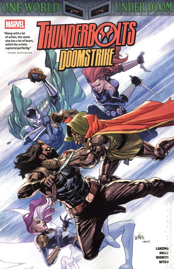 1st printing. Collects Thunderbolts: Doomstrike (2025 Marvel) #1-5. Written by Collin Kelly and Jackson Lanzing. Art by Tommaso Bianchi. Cover by Leinil Francis Yu. Revolution...or rebellion...like lightning! Doom took over the world — and Bucky Barnes helped him do it. To atone for his unwitting role in Dooms triumph, Bucky assembles a team with one goal: burn it all down. But when Buckys saboteurs — including Black Widow and Songbird — launch a no-holds-barred campaign to tear Dooms Empire apart, the newfound emperor of Earth decides to prove that revolution ends in blood. Ghost Rider 44, Sharon Carter, U.S. Agent and the Midnight Angels join the action — but standing in the way of the Thunderbolts are…the Thunderbolts?! Who will win in the battle of new vs. old? And just what does Doom have planned if he can get his hands on Bucky? Softcover, 120 pages, full color. Rated T+ Cover price $17.99.