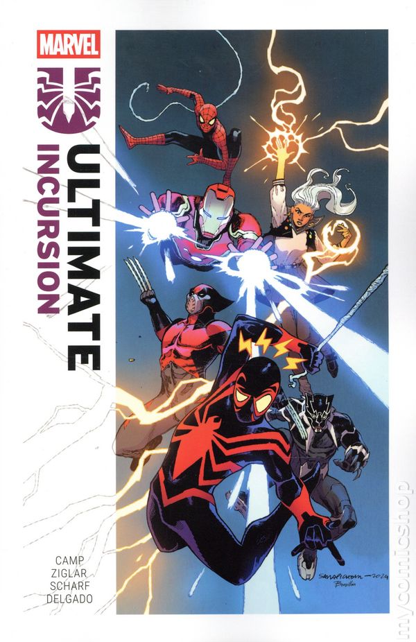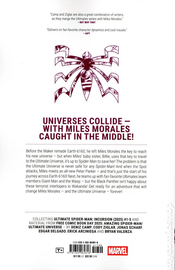 1st printing. Collects Ultimate Spider-Man: Incursion (2025 Marvel) #1-5 and a story from The Amazing Spider-Man/Ultimate Universe (2025 Marvel) FCBD. Written by Deniz Camp and Cody Ziglar. Art by Jonas Scharf. Cover by Sara Pichelli. The Ultimate Universes first-ever event series! Universes collide — with Miles Morales caught in the middle! Before the Maker remade Earth-6160, he left Miles Morales the key to reach his new universe — but when Miles baby sister, Billie, uses that key to travel to the Ultimate Universe, its up to Spider-Man to save her! The problem is that the Ultimate Universe is never safe for any Spider-Man! And when the Spot attacks, Miles meets an all-new Peter Parker — and thats just the start of his journey across Earth-6160! Next, he teams up with fan-favorite ULTIMATES team members Giant-Man and the Wasp — but the Black Panther isnt happy about these terrorist interlopers in Wakanda! Two of todays most exciting writers, Deniz Camp (ULTIMATES) and Cody Ziglar (MILES MORALES: SPIDER-MAN) join forces with rising-star artist Jonas Scharf (ULTIMATE UNIVERSE: ONE YEAR IN) for an adventure that will change Miles Morales — and the Ultimate Universe — forever! Softcover, 128 pages, full color. Rated T+ Cover price $17.99.