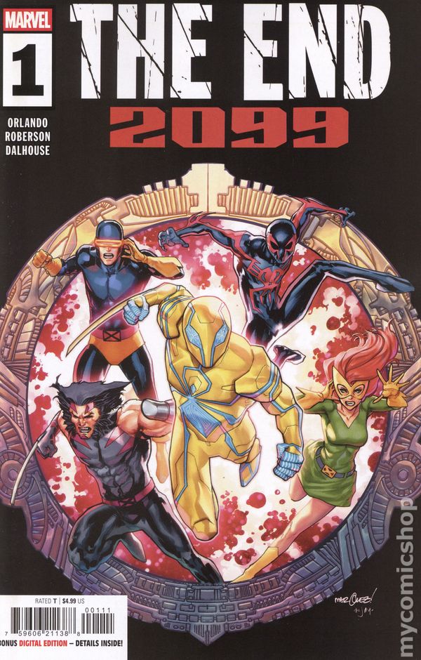 Limited 1 for 25 Retailer Incentive Variant Cover.(W) Steve Orlando (A) Ibraim Roberson (CA) Edwin Galmon ONE FUTURE ENDS...ANOTHER BEGINS. 3099! From the ashes of the AGE OF HEROES, a new generation of vigilantes, like SPIDER-MAN 2099, NOVA 2099 and RED HULK 2099, emerged in the dystopia that followed to forge a bright, new future - a future that has come to an end in the face of ABYSSYUS, a horrifying fusion of a KNULL-INFECTED GALACTUS! As the DEVOURER IN BLACK descends upon the world, a deal is struck with the devil - LITERALLY as MEPHISTO bets the fate of 2099 in a brutal battle of survival, pitting the warriors of 2099 against fan-favorite characters from across the Multiverse - like AGE OF APOCALYPSE-ERA WOLVERINE, CLAREMONT/BYRNE-ERA CYCLOPS AND MARVEL GIRL, HOUSE OF M-ERA WANDA and so many more - each battling for their own universe's survival! It's hero against hero in this no-holds-barred war against extinction! But as Marvel's past and present duke it out, only one thing is certain: The future is coming, and it's arriving in the form of…SPIDER-MAN 3099?! Cover price $4.99.