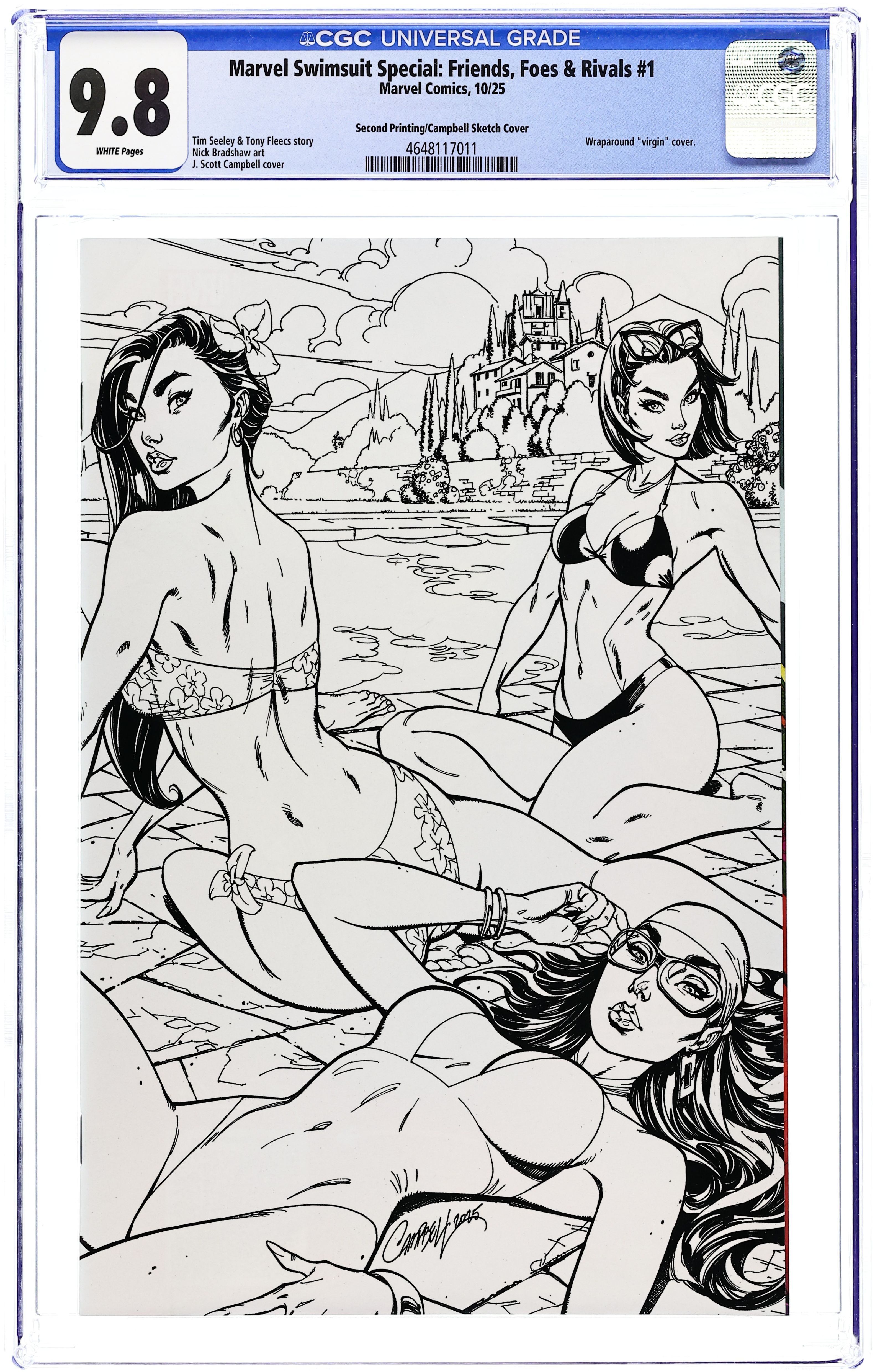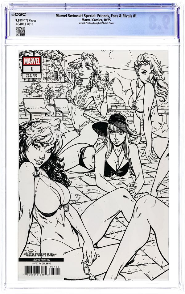 2nd Printing. Limited 1 for 25 Retailer Incentive Variant Cover. Written by Tim Seeley and Tony Fleecs. Cover by J Scott Campbell. Art by Nick Bradshaw. (for 15-page story), Joshua Cassara (X-Men pin-up), Marguerite Sauvage (Rogue and Gambit pin-up), Mahmud Asrar (Black Cat and Spider-Man pin-up), Aaron Kuder (Fantastic Four pin-up, plus reprint Deadpool/Wolverine cover art as pin-up), John Tyler Christopher (reprint Deadpool cover art as pin-up), Ron Lim (pin-up), Nic Klein (pin-up), David Marquez (Cloak and Dagger pin-up), Olivier Coipel (reprint Namor cover art as pin-up), Mirka Andolfo (Rocket Raccoon and Gamora pin-up), Rian Gonzales (reprint Venom cover art as pin-up), Ryusei Yamada (Captain Marvel pin-up), Luciano Vecchio (Power Man and Iron Fist pin-up) and Adam Hughes (reprint Sensational She-Hulk cover art as pin-up). THE SWIMSUIT SPECIAL RETURNS! Roxxon Comics is at it again when they release their own UNAUTHORIZED SWIMSUIT SPECIAL! Wasp is on the case and seizes the opportunity for Marvel's heroes to do their OWN swimwear fashion shoot all over the world! But fear not, True Believers, we know what you're REALLY here for! This super-sized special features splash page after splash page of gorgeous art, but with a story so you can pretend you're "reading it for the articles"… 40 pages, full color. Rated T+ Cover price $5.99.