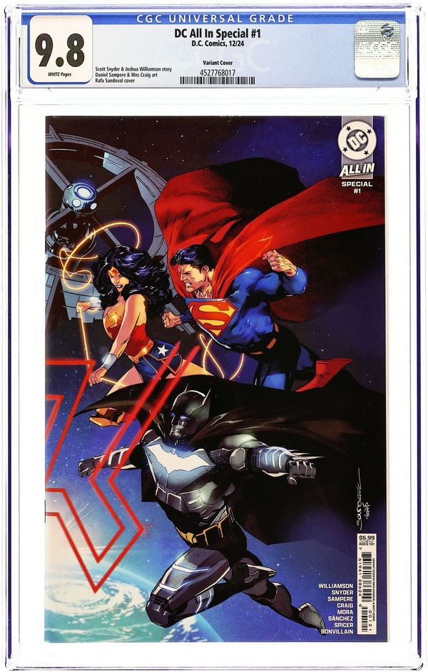 Written by Scott Snyder - Joshua Williamson. Art by Daniel Sampere - Wes Craig. Cover by Rafa Sandoval. THE NEXT EPIC CHAPTER OF DC HISTORY BEGINS HERE...PRESENTED AS A STARLING, SYMMETRICAL FLIPBOOK! DON'T MISS IT! Following the events of DC's blockbuster storyline Absolute Power, the heroes of the core DC Universe have fought against the deep divisions in the world around them to usher in a new era of unity. And it's just in time, too--because Darkseid has returned. Superman must gather every hero on Earth to hold the line against a very different version of the Lord of Apokolips, as they raise our cosmic defenses and prepare for war...and when the first blows land, the shock waves will ripple into every series in the DCU and shake the nature of their reality to its core! But little do they know...the greater threat is still to come. For there is another Earth: the Absolute Universe. Here, DC's biggest icons are coming of age with fewer advantages and facing greater opposition than ever before...while miraculously retaining the immutable heroism that has inspired fans for decades. But can they really protect the light that shines inside them when the world in which they live is hurtling toward a terrible destiny? 64 pages, full color. Rated T+ Cover price $5.99.