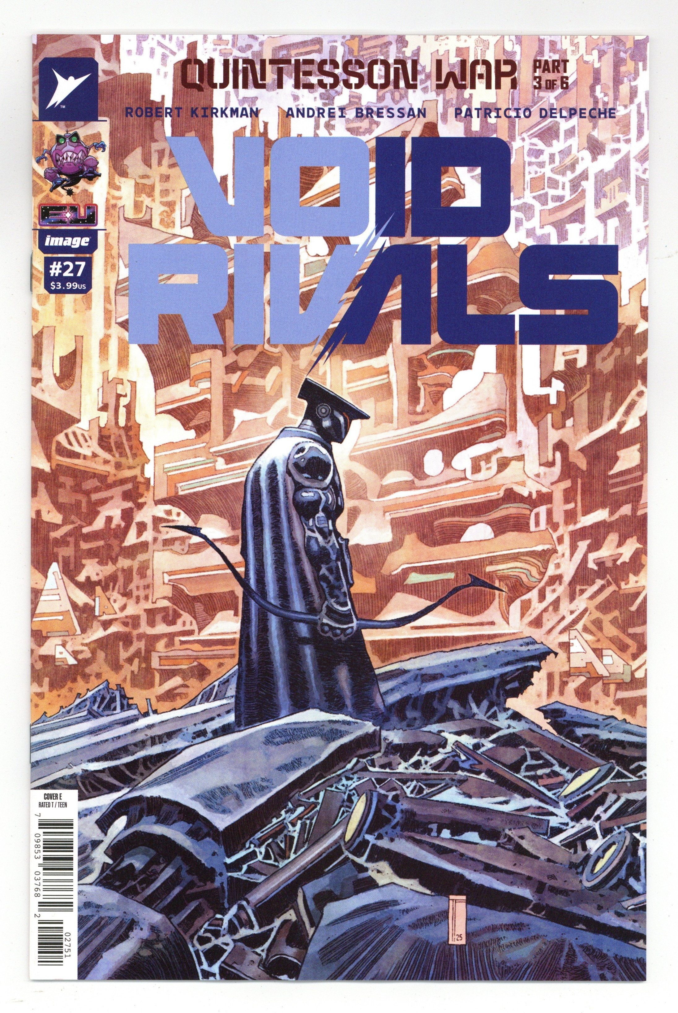 $20.00Limited 1 for 50 Retailer Incentive Variant Cover. (W) Robert Kirkman (A) Andrei Bressan, Patricio Delpeche (CA) Tony Fejzula THE QUINTESSON WAR CONTINUES! The Quintessons gain the upper hand in the brutal war being waged on the Sacred Ring… but could Pythona, of all people, hold the key to victory? 28 pages, rated T, full color Cover price $3.99.