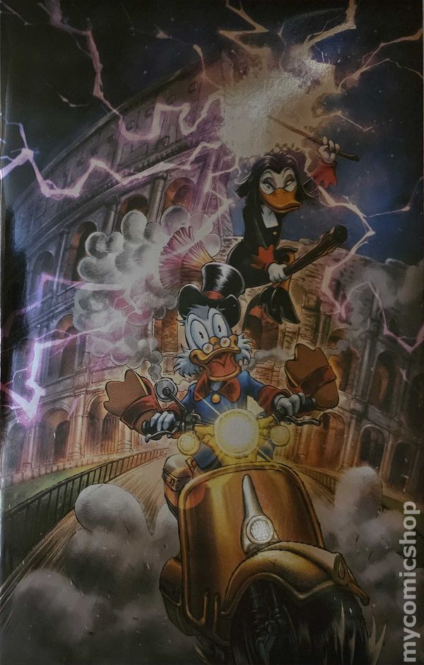 Limited 1 for 10 Retailer Incentive Variant Foil Cover. Written by Brandon Montclare. Art by Tommaso Ronda. Cover by Carlo Lauro. Over the years, Scrooge McDuck has invested in every kind of industry that turns a profit, from tea farming to sturgeon fishing to uranium mining. So it only stands to reason that he's also the owner of Duckburg's premiere movie house, the Scrooge-A-Rama Dome, which he built to be to most palatial of motion picture palaces - inspired by both the grandeur of the Colosseum in Rome and the chance to charge top-dollar admission fees! But something is amiss with the Dome's receipts, and the explanations from the projectionist and the ticket clerk, Messrs. Franks and Beans, aren't adding up. When Scrooge and his nephews Huey, Dewey, and Louie pay the theater a visit to find out more, everybody is in for a surprise when the true tale behind its fiduciary discrepancies is revealed! DuckTales author BRANDON MONTCLARE and artist TOMMASO RONDA target all four audience quadrants with their second blockbuster issue - bolstered by eye-catching covers from IVAN BIGARELLA, FRANCESCO TOMASELLI, CARLO LAURO, and ALAN QUAH! 32 pages, full color. Cover price $9.99.