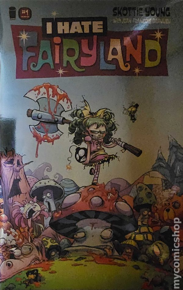 Foil Cover. Written by Skottie Young. Art and Cover by Skottie Young. Celebrating the 10th Anniversary of I HATE FAIRYLAND, this facsimile edition reprints the first issue of the best-selling series. The Adventure Time/Alice in Wonderland-style epic that smashes it's cute little face against Tank Girl/Deadpool-esque violent madness has arrived. In an adventure that ain't for the little kiddies, (unless you have super cool parents, then whatever), you'll meet Gert-a six year old girl who has been stuck in the magical world of Fairyland for thirty years and will hack and slash her way through anything to find her way back home. Join Gert and her giant battle-axe on a delightfully blood soaked journey to see who will survive the girl who HATES FAIRYLAND! 28 pages, full color. Rated M Cover price $4.99.