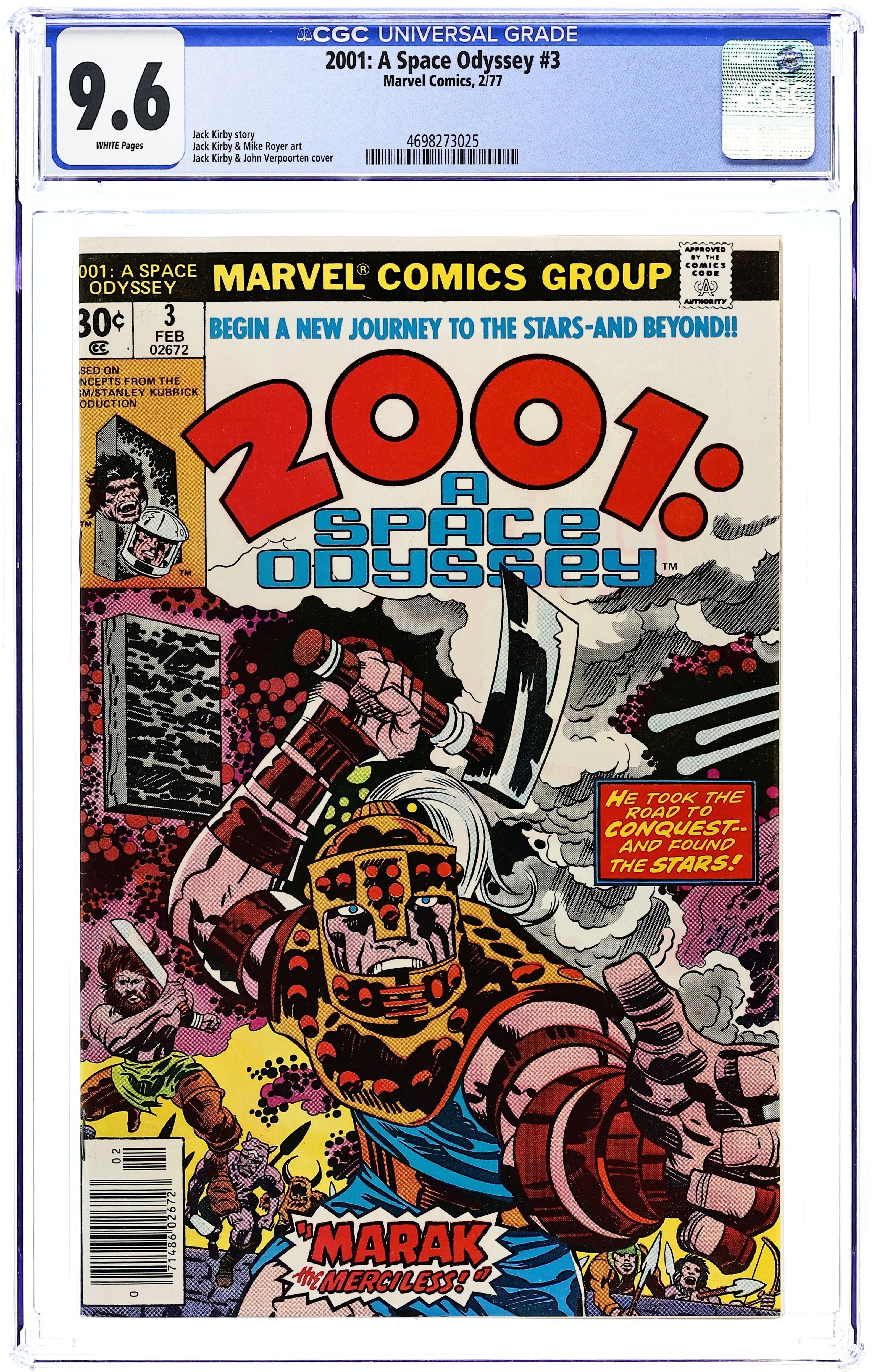 Starts May 11 Written by Jack Kirby. Art by Jack Kirby and Mike Royer. Cover by Jack Kirby and Frank Giacoia. Marik reaches the land of Jalessa and becomes queen. In 2001, a space station orbiting Mars is doomed to destruction by a meteor strike. The monolith rescues Herb Marik and transpors him to an area similar to Jalessa's kingdom. Based on concepts from the film by Stanley Kubrick & Arthur C. Clarke. 36 pages, full color. $0.30. Cover price $0.30.