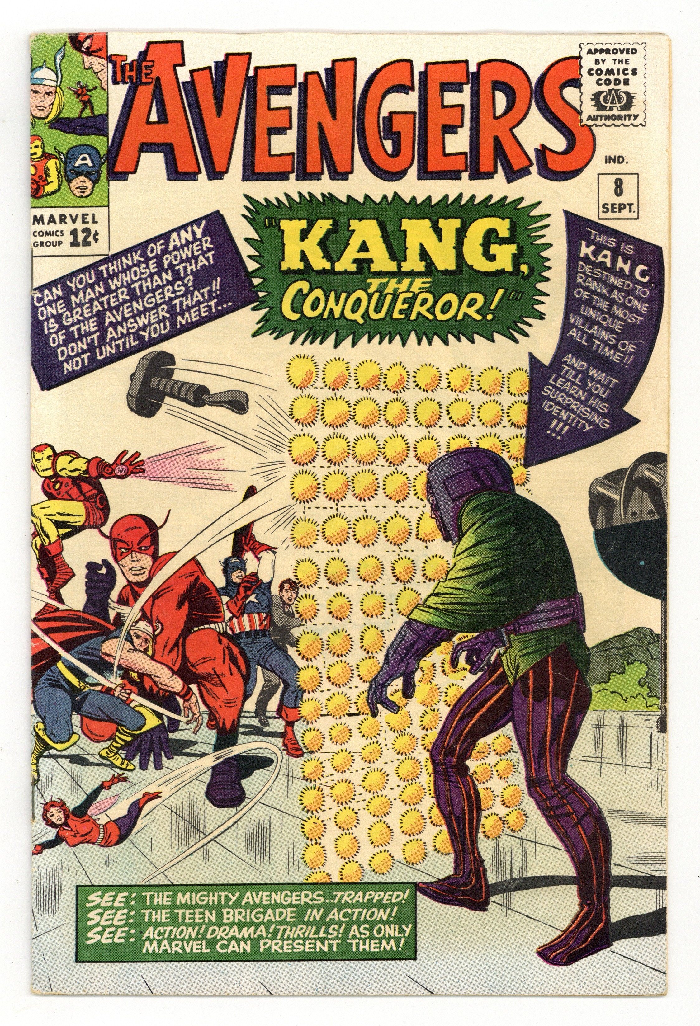 Starts Jan 19 Cover pencils by Jack Kirby, inks by Dick Ayers. Kang, The Conqueror!, script by Stan Lee, pencils by Jack Kirby, inks by Vince Colletta cover; Kang appears and demands to be made ruler of the Earth; The Avengers attempt to stop him, but it comes down to Wasp and the Teen Brigade to slow Kang long enough for the rest of the Avengers to free themselves and put an end to Kang's threat. Roster: Captain America, Thor, Iron Man, Wasp, Giant-Man, and Rick Jones. First appearance of Kang. 36 pgs. $0.12. Cover price $0.12.