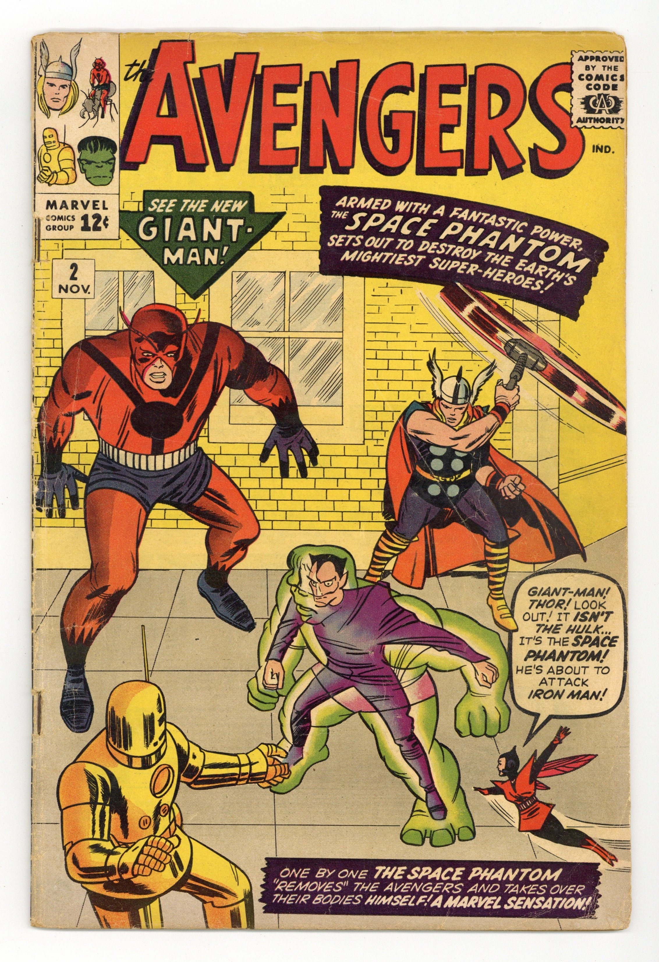 Starts Jan 3 Cover pencils by Jack Kirby, inks by Sol Brodsky. The Avengers Battle the Space Phantom, script by Stan Lee, pencils by Jack Kirby, inks by Paul Reinman; The Space Phantom comes to Earth to defeat the Avengers; If he can, then nothing can stop his race from invading Earth. Roster includes Thor, Iron Man, Wasp, Giant Man, and the Hulk, who leaves the team at the end of the issue. Rick Jones appearance. First appearance of the Avengers Mansion. 36 pgs. $0.12. Cover price $0.12.