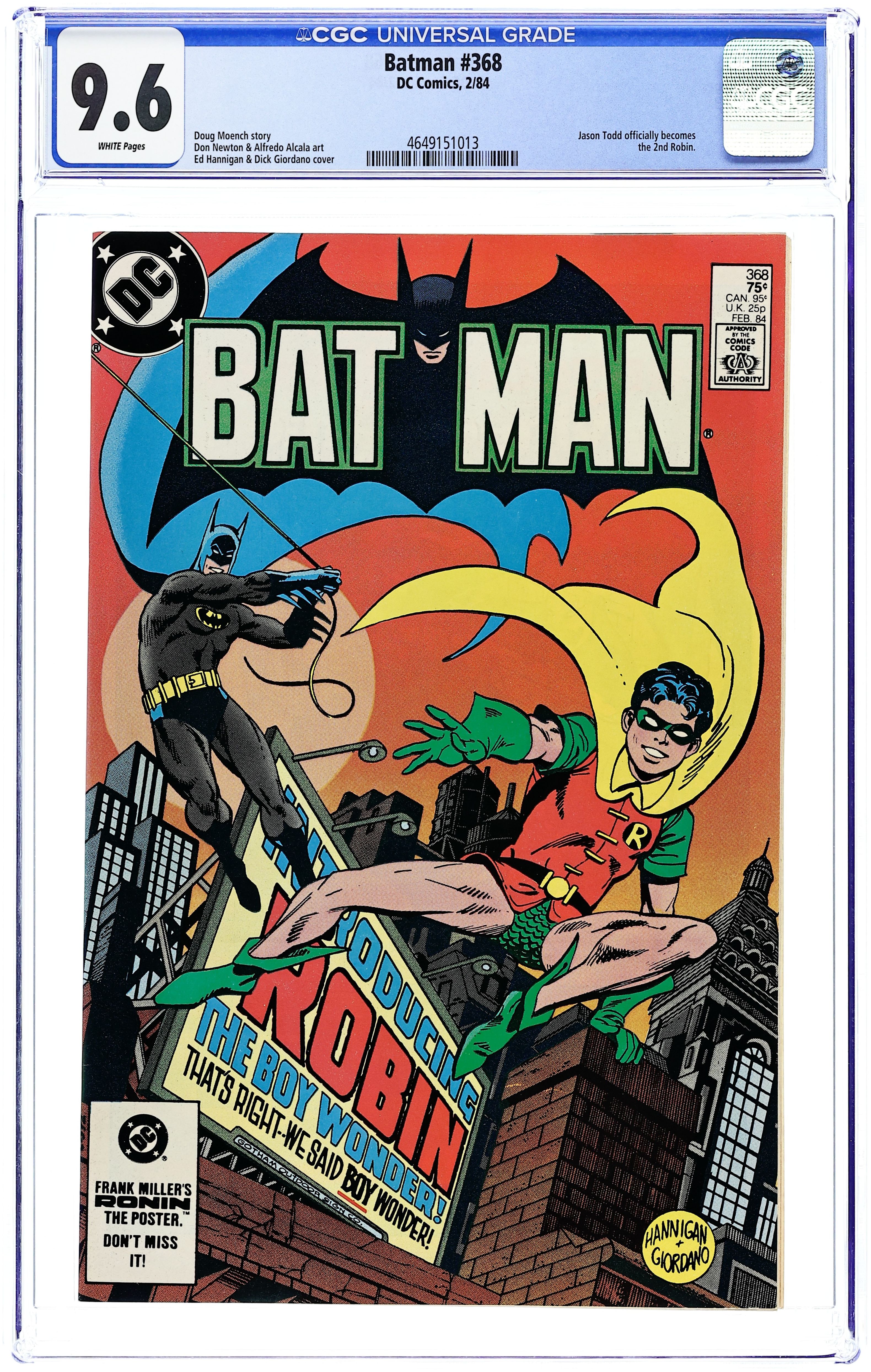 Ends Feb 23 7:29 PM CST Bid History 9 bids Current Bid $61 Your Secret Max Bid If you'd like to bid, please log in or register. Direct Edition. Cover pencils by Ed Hannigan, inks by Dick Giordano. In this key issue, Jason Todd begins as the new Robin (with a new costume) in a book-length story titled "A Revenge of Rainbows" starring Batman, Robin, Crazy-Quilt, Dick Grayson, Vicki Vale, Joker (flashback), Two-Face (flashback), Scarecrow (flashback), and Penguin (flashback), script by Doug Moench, pencils by Don Newton, inks by Alfredo Alcala; Dick Grayson officially passes along the mantle of Robin to Jason Todd, who accompanies Batman on a "shakedown cruise" around Gotham. 36 Pages, Full Color. Cover price $0.75.