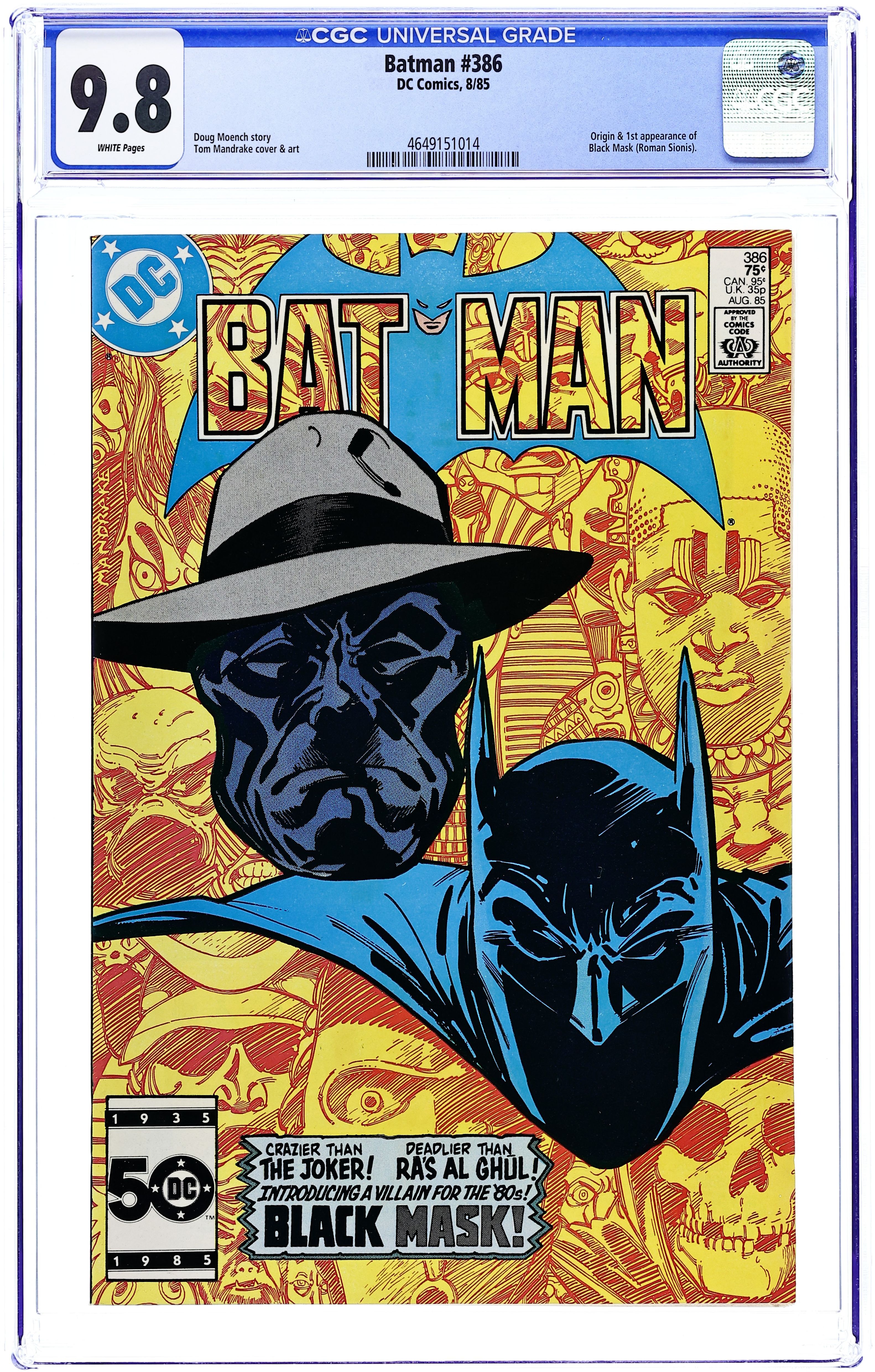 Ends Feb 23 7:29 PM CST Bid History 14 bids Current Bid $180 Your Secret Max Bid If you'd like to bid, please log in or register. Direct Edition. Cover by Tom Mandrake. "Black Mask: Losing Face" starring Batman, Commissioner Gordon, Harvey Bullock, Black Mask (1st appearance and origin), and Lucius Fox, script: Doug Moench, art by Tom Mandrake; Roman Sionis loses his family's company, Janus Cosmetics, and turns to a life of crime as Black Mask. Part 1 of 3, continued in Detective Comics (1937) #553. Missive by letter hack T.M. Maple. 36 Pages, Full Color. Cover price $0.75.