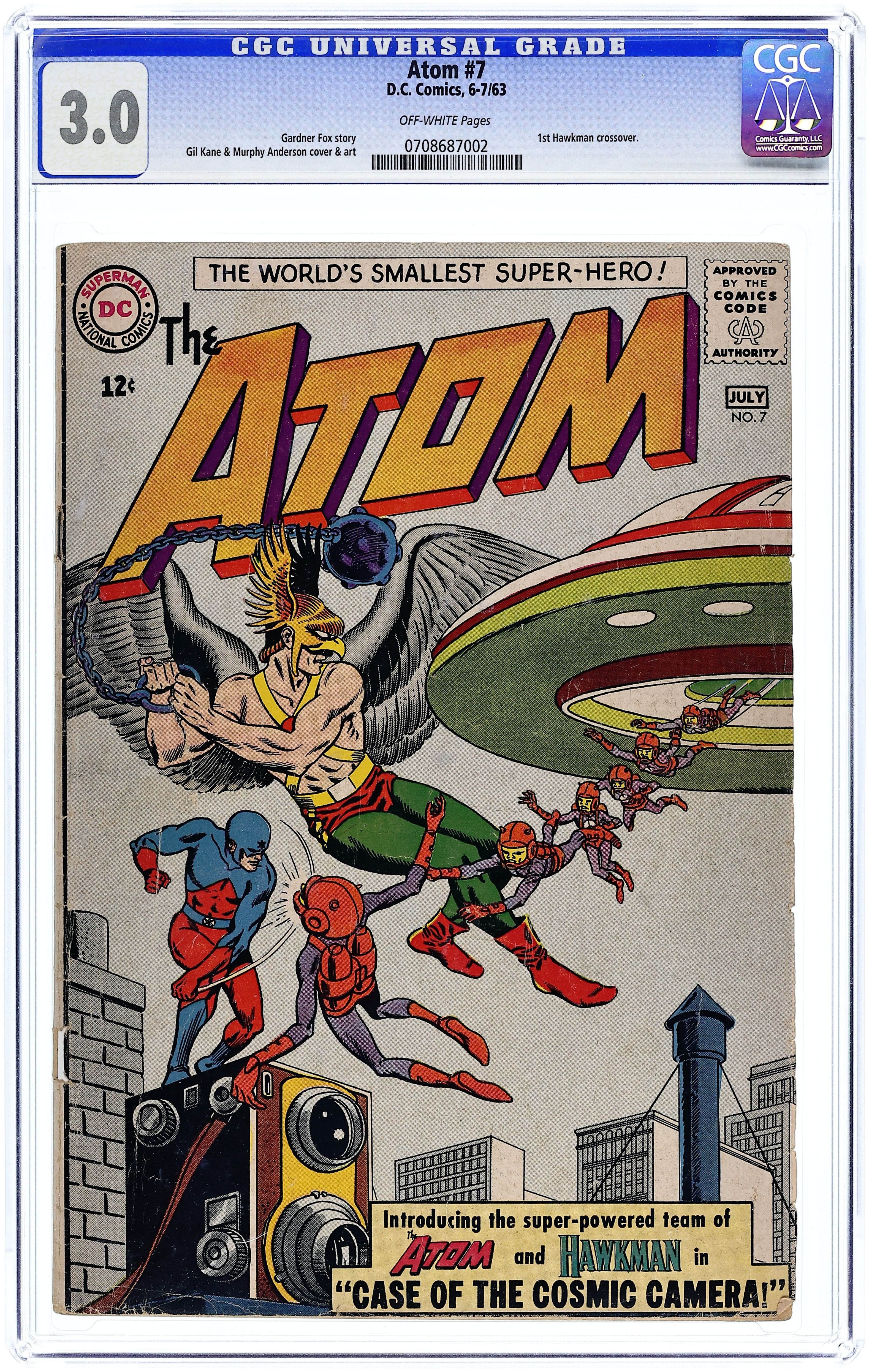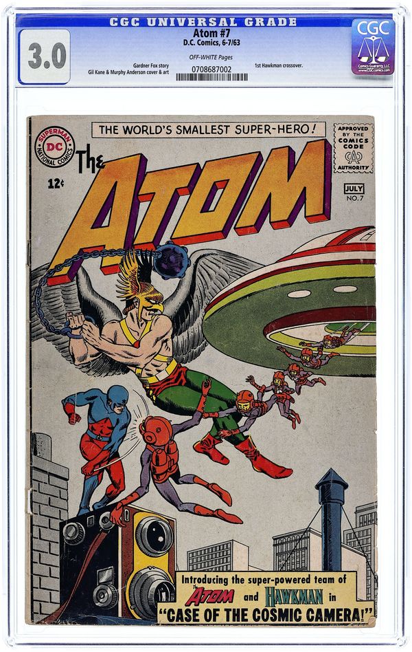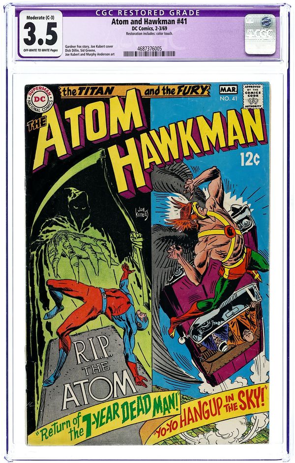 Starts May 4 Cover by Joe Kubert. "Return of the Seven-Year-Dead Man," script by Gardner Fox, pencils by Dick Dillin, inks by Sid Greene; An amnesiac crook regains his memory after seven years and goes after an old partner who didnt show up for his memorial service, but the Atom intervenes. "Yo-Yo Hangup in the Sky," script by Gardner Fox, pencils by Joe Kubert, inks by Murphy Anderson; Taking Harris back to his spaceship, Hawkman and his passenger encounter a gravity-defying auto, which he rescues, despite being similarly affected; The car's passengers turn out to be bank robbers trying to make a getaway, and they try to shoot him, unsuccessfully; Hawkman finally questions Harris, determining that his moonstone ring, bought that morning, is the teleportation device, and that the anti-gravity effect came from his own spaceship's grappler and repelling beams, accidentally activated by Harris when he was aboard. 36 pgs., full color. $0.12. Cover price $0.12.