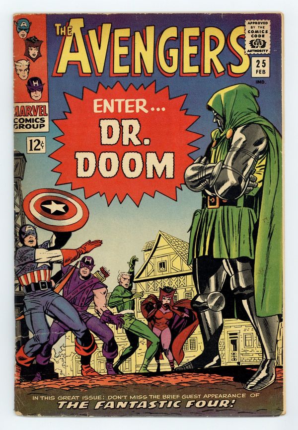 Starts Apr 4 Cover pencils by Jack Kirby, inks by Dick Ayers. "Enter... Dr. Doom!", script by Stan Lee, pencils by Don Heck, inks by Dick Ayers; Scarlet Witch and Quicksilver recieve a letter from their Aunt in Latveria and decide to visit her; When they arrive they are jailed and discover it is a trap set up by Doctor Doom, who decides defeating the Avengers will instill fear in to the Fantastic Four,making them easy to defeat; The Fantastic Four attempt to assist the Avengers, but are not allowed, as interference could spark an international incident; Nevertheless, the Avengers escape and fight Doom to a standstill, where he causes a diversion and escapes. Avengers roll call: Captain America, Hawkeye, Quicksilver, and the Scarlet Witch. Guest appearance by the Fantastic Four. Letter to the editor from writer Steve Utley. Reprinted in Marvel Triple Action #19. 36 pgs., full color. $0.12. Cover price $0.12.
