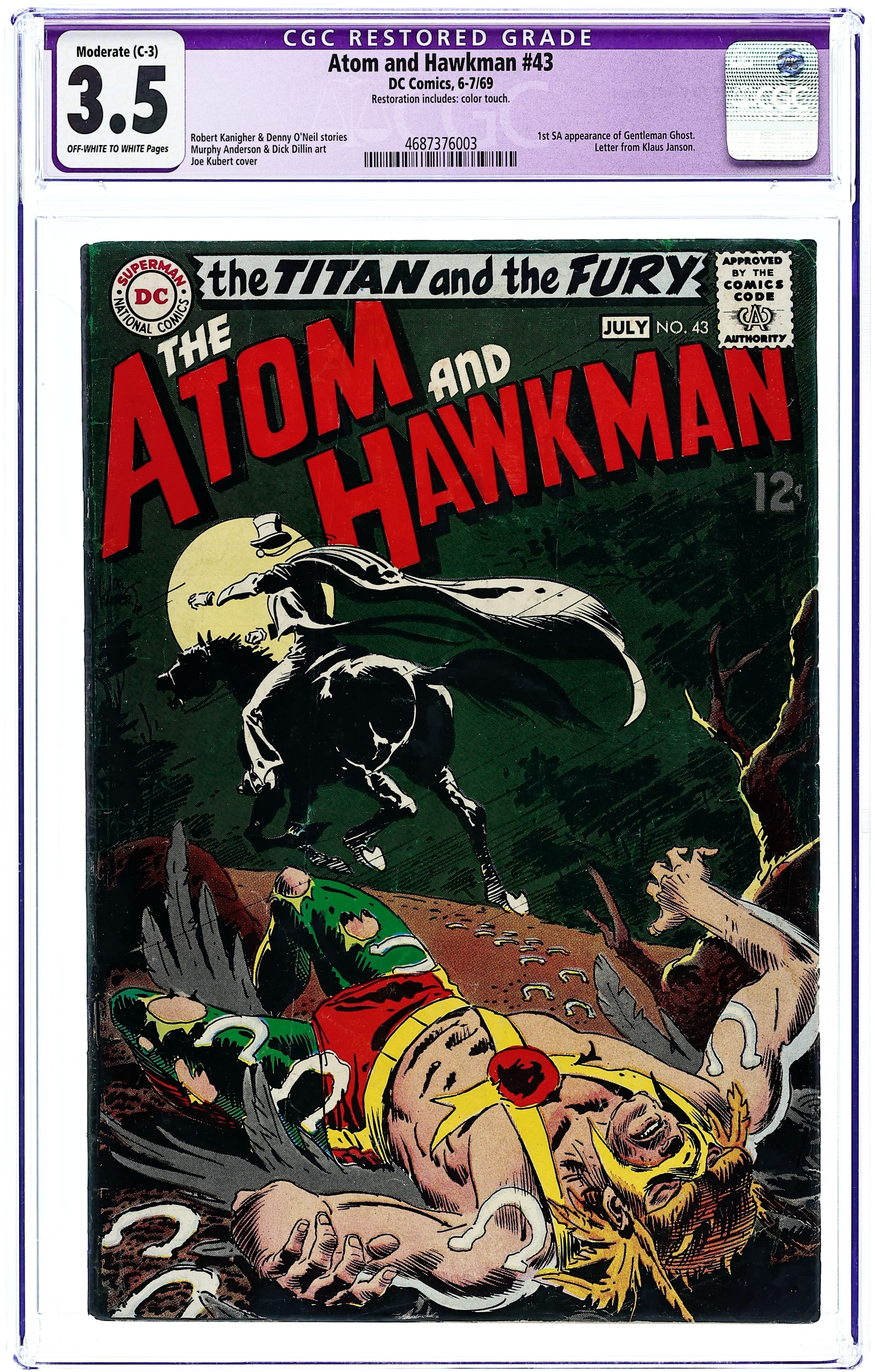 Starts May 4 Cover by Joe Kubert. "Come to My Hanging," script by Robert Kanigher, art by Murphy Anderson; Hawkman and Hawkgirl learn that the Gentleman Ghost has been staging a series of robberies at Trafalgar Square in London, England; They fly across the ocean to Europe and being investigating the sightings; They find the Ghost and his cronies near Nelson's Monument in the square; Hawkman dives into the thugs and incapacitates them with his mace, but the Gentleman Ghost manages to grab a hold of Hawkgirl; Hawkman tries to rescue her, but the Ghost and Hawkgirl both disappear; Hawkman tracks them back to London Tower. "Buzzin', Buzzin' - Who's Got the Buzzin'?", script by Denny O'Neil, pencils by Dick Dillin, inks by Sid Greene; Ray Palmer attempts to perform an experiment before his peers when suddenly a small insect distracts him, causing him to forget what he was trying to do; Horace McByrd, head of the Physics department, harshly criticizes Palmer, angering him to great length; Ray turns into the Atom; He goes into a subatomic realm and fights a mindless monster. Letter from comics writer Martin Pasko. 36 pgs., full color. $0.12. Cover price $0.12.