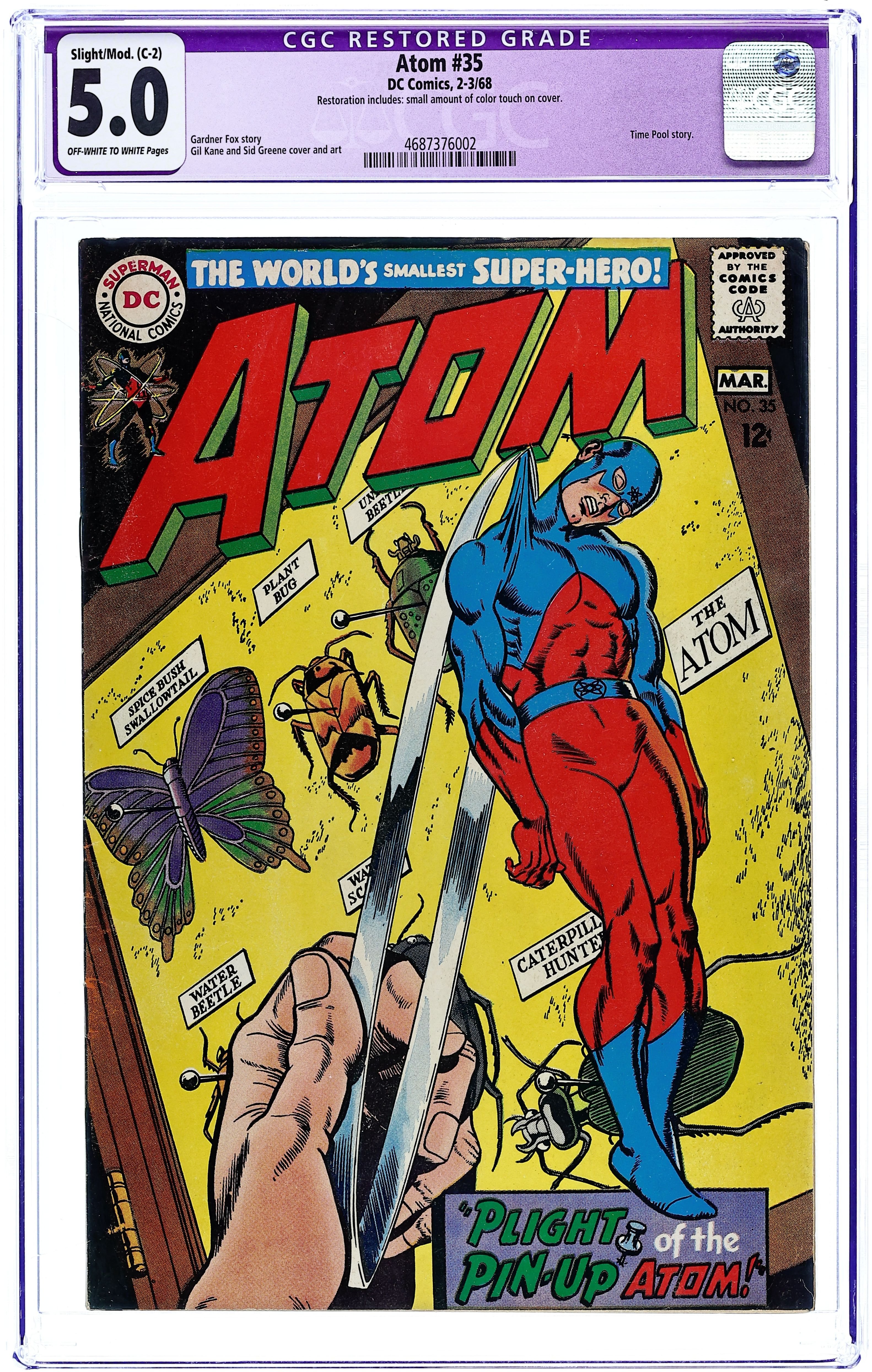 Starts May 4 Cover pencils by Gil Kane, inks by Sid Greene. "Plight of the Pin-Up Atom!", script by Gardner Fox, pencils by Gil Kane, inks by Sid Greene; A gang of crooks is seeking to enlist the aid of a master planner named Smarts to organize their next heist; However, Smarts is notorious for being an obsessive collector of items; This day is no exception as he suddenly decides that he wants a bottle collection and refuses to aid the crooks unless they steal him the finest collection of bottles they can find; The Atom battles the crooks. The Atom in "Col. Blood Steals the Crown Jewels!", script by Gardner Fox, pencils by Gil Kane, inks by Sid Greene; When visiting Alpheus Hyatt, Ray Palmer sees Alpheus pulling an item out of the Time Pool from London circa 1671; To their surprise, it turns out to be royal jewels that belong in the Tower of London. Reprint backup story, "Last Day on Earth!", script by John Broome, art by Sy Barry. Letter to the editor from comic writer Gerry Conway and Irene Vartanoff. 36 pgs., full color. $0.12. Cover price $0.12.