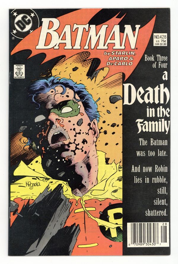 Starts Apr 20 First printing. Direct Edition. Cover art by Mike Mignola. "A Death in the Family" part 2 of 4, script by Jim Starlin, pencils by Jim Aparo, inks by Mike DeCarlo; Jason meets his real mother, Sheila Haywood, but she turns out to be working for the Joker and allows her son to fall into his deadly hands inside of a warehouse; Joker beats Robin with a crowbar and leaves him for dead as a badly beaten Robin attempts to save his mom and himself from the dynamite left behind by the Joker as he leaves them both to a horrible fate; Batman watches in horror as the warehouse containing Jason and Sheila blows up, too late to stop the Joker. Infamous Phone Poll on death or life for Robin (Jason Todd). The Direct Sales copies of this comic, released first, contained a 1-800 phone number to either vote "for" or "against" the death of Jason Todd on the inside back cover. The newsstand copies, released 3 weeks later did not contain the 1-800 number. NOTE: Most issues from 397-432 were reprinted in 1989 and sold in multipacks. These 2nd and 3rd prints have back cover ads dated 1989. 52 Pages, Full Color. Cover price $1.50.