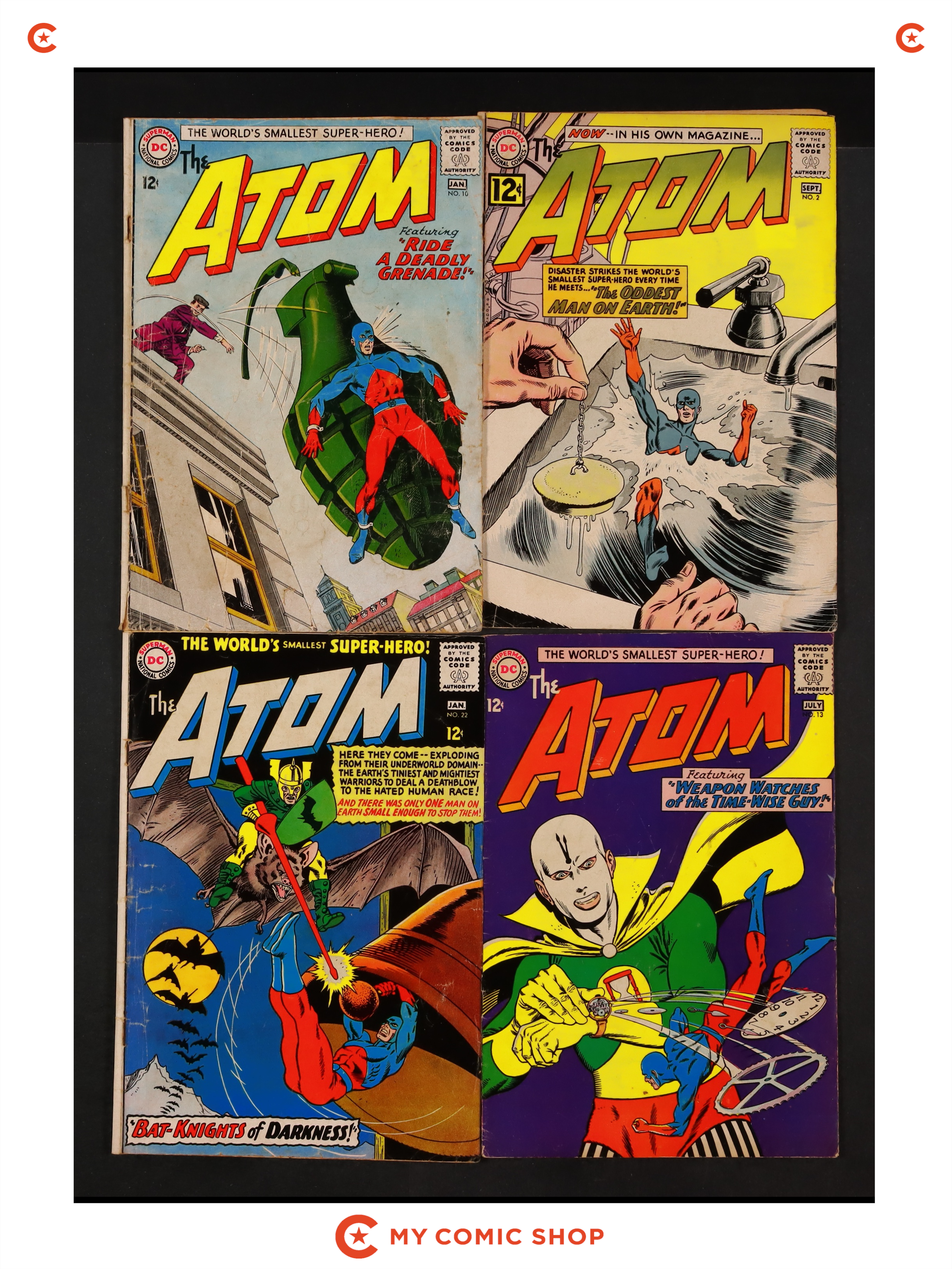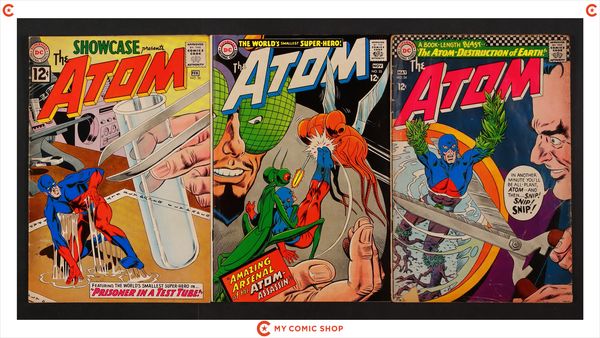Issues 2, 10, 13, 22, 24, and 33 of Atom (1962); and 36 of Showcase (1956-1978). Most will grade in the VG to GD range.