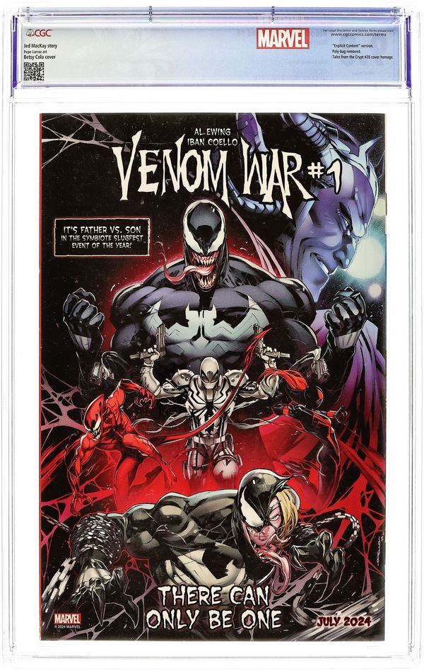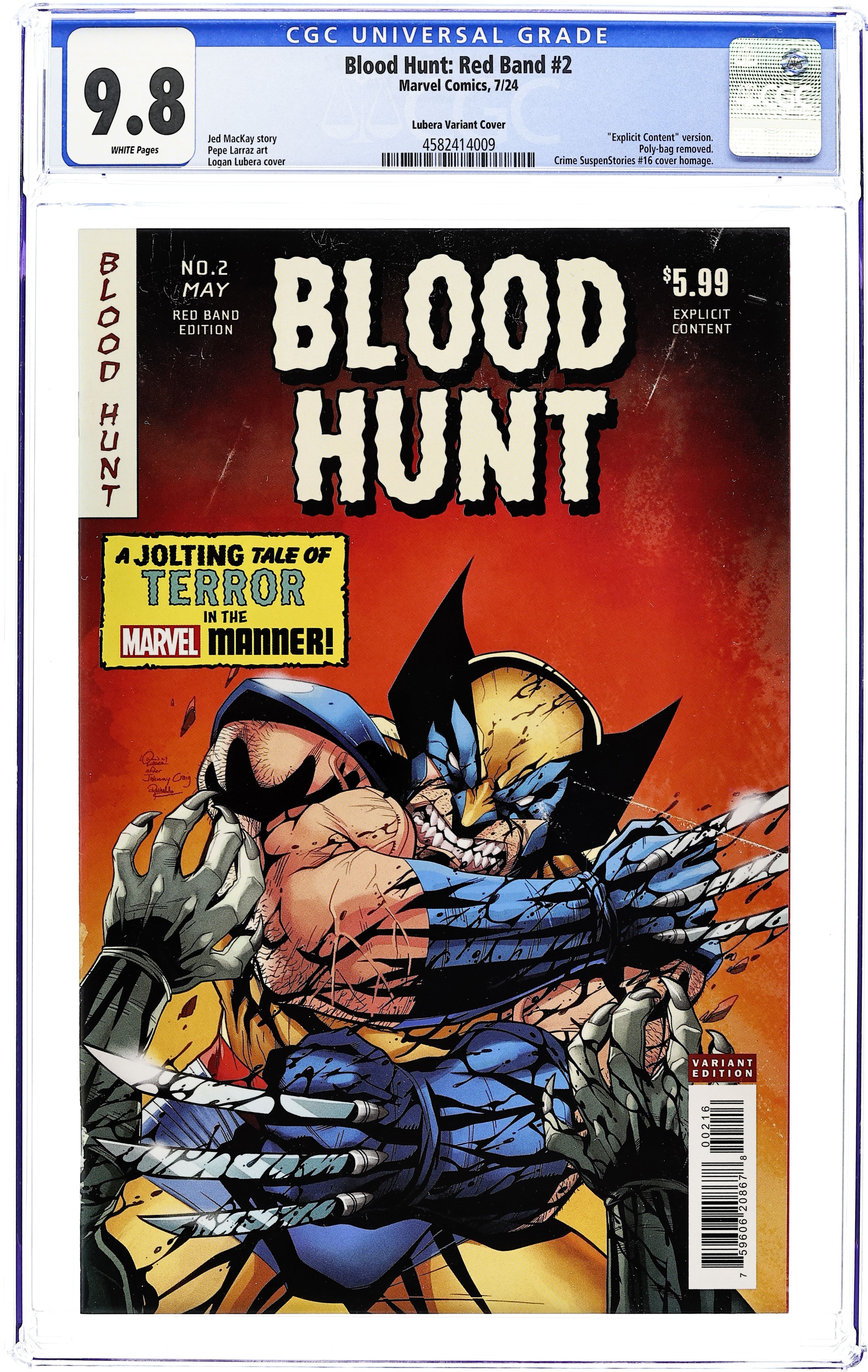 Ends Feb 23 7:41 PM CST Bid History 4 bids Current Bid $34 Your Secret Max Bid If you'd like to bid, please log in or register. Limited 1 for 25 Retailer Incentive Variant Cover. NOTE: Issue will be unbagged for grading. Written by Jed MacKay. Art by Pepe Larraz. Cover by Carlos Magn. Now with extended sequences of terror too strong to unleash in the regular edition straight from the mind of Pepe Larraz! Please note: The digital codes in these BLOOD HUNT Red Band Editions will unlock the regular versions of the BLOOD HUNT series digitally. 32 pages, full color. Rated M Cover price $5.99.