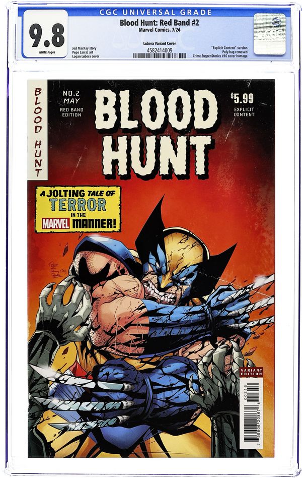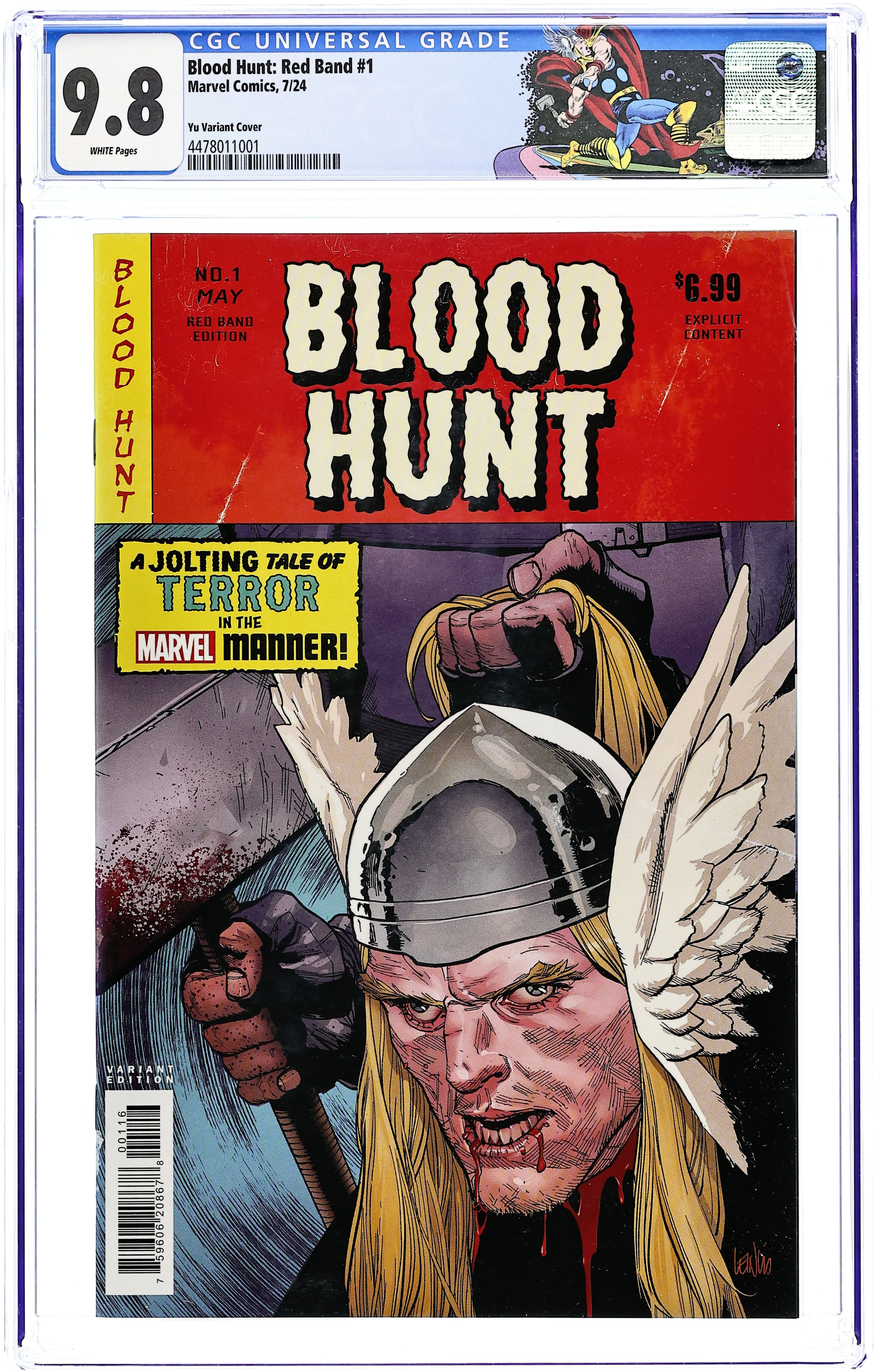 Starts Apr 4 NOTE: Issue will be unbagged for grading. Limited 1 for 25 Retailer Incentive Variant Cover. Issue will be unbagged for grading. Written by Jed MacKay. Art by Pepe Larraz. Cover by Leinil Francis Yu. THERE WILL BE (MORE) BLOOD! EXPANDED AND UNEXPURGATED - AND POLYBAGGED FOR YOUR PROTECTION - THE RED BAND EDITION OF BLOOD HUNT #1 CONTAINS ADDITIONAL PAGES OF UNEXPURGATED MATERIAL THAT ARE TOO EXPLICIT FOR THE REGULAR EDITION! 38 pages, full color. Rated T+ Cover price $6.99.