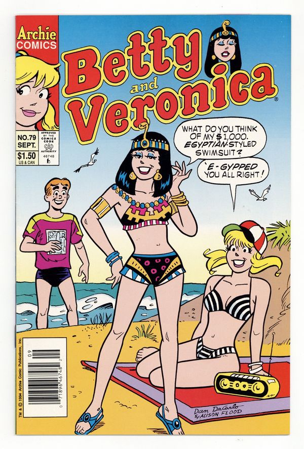 Starts Feb 9 Newsstand Edition. Written by Frank Doyle, George Gladir, and Mike Pellowski. Art by Dan DeCarlo and Alison Flood. Cover by Dan DeCarlo and Alison Flood. Betty and Veronica try to have an afternoon of fun at the beach and still protect their picnic lunch. Learning from Veronica that Betty swims better when she's angry, Coach Clayton conspires with Veronica, Archie and Jughead to make Betty furious before the big Swim Meet. Archie and Jughead convince a new kid in the neighborhood to play with their baseball team after seeing the skill the teen demonstrates. Tired of Veronica monopolizing the male attention because of her name and status, Betty talks her into going on an environmental hike where nobody will know who she is. Betty & Veronica advice column. Club Med ad with the Archie gang, art by Stan Goldberg. 36 pages, full color. $1.25. Cover price $1.25.