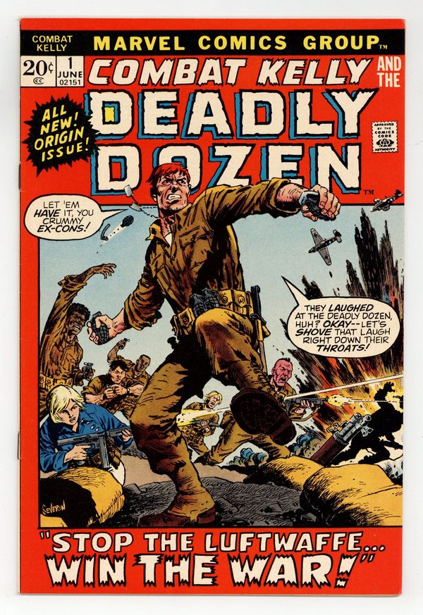 Starts Mar 23 "Stop the Luftwaffe...Win the War!" Combat Kelly and his Deadly Dozen is a Sgt. Fury spin-off that was cancelled after nine issues. The titular character comes from the 1950s when Marvel was known as Atlas. In this first issue, Kelly leads a team of ex-cons (ala The Dirty Dozen) into Germany on a mission to retrieve a Nazi scientist. Script by Gary Friedrich, pencils by Dick Ayers, inks by Jim Mooney. Cover by John Severin. Cover price $0.20.