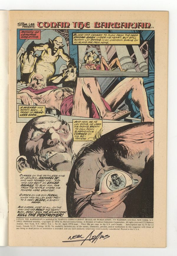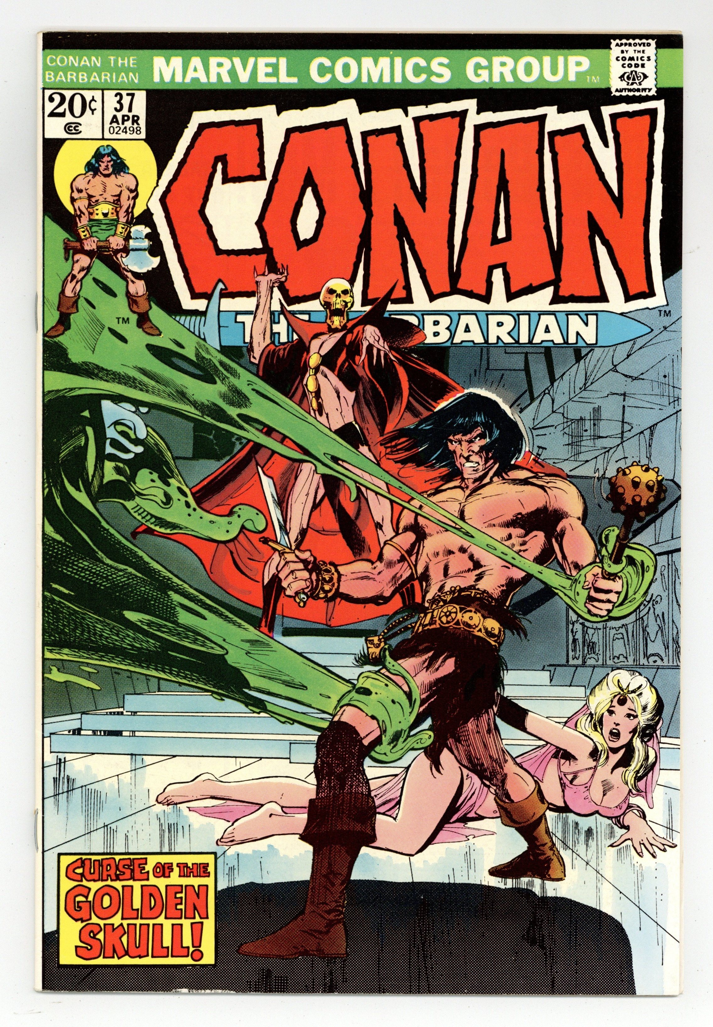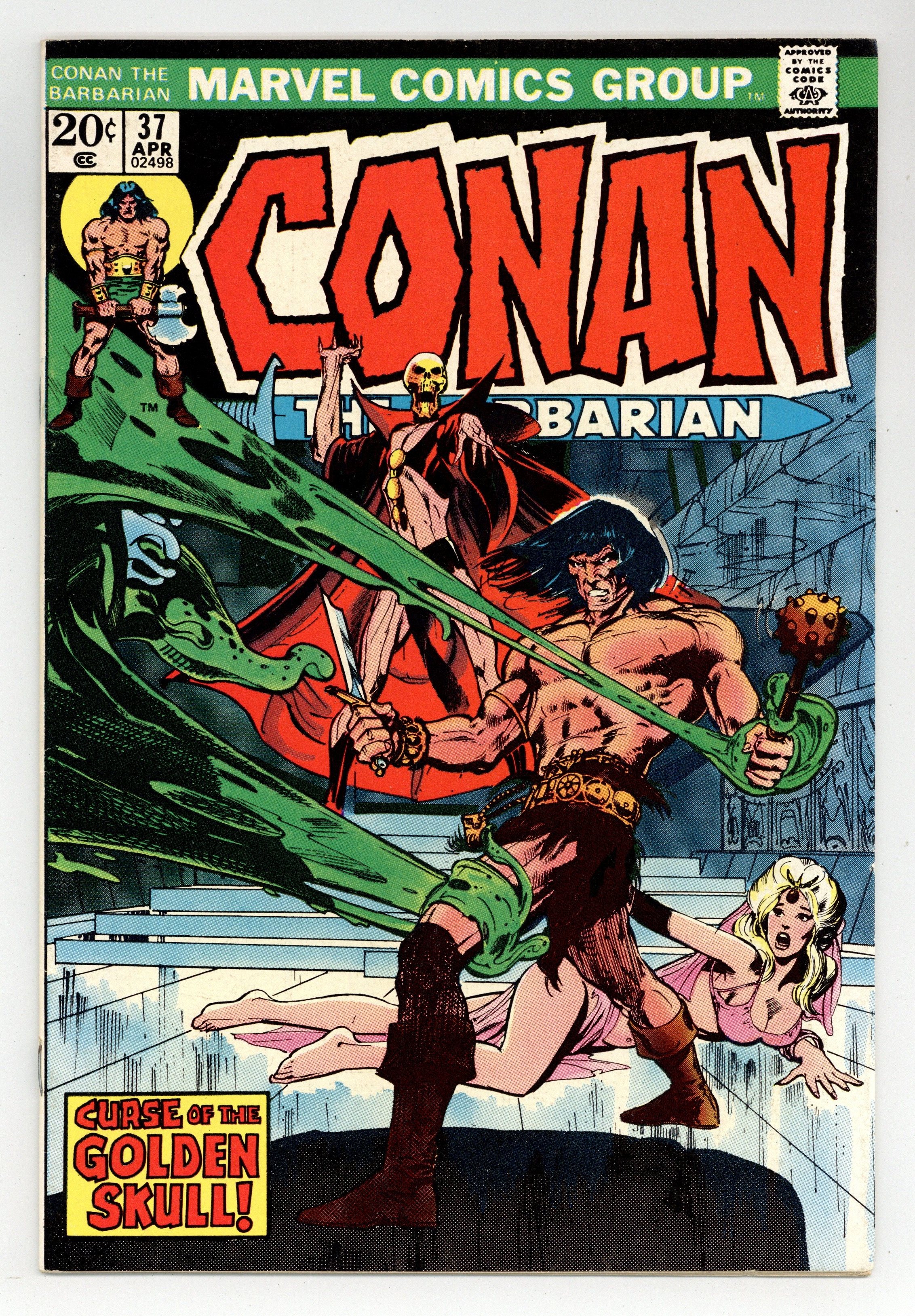 Starts Mar 23 Last 20-cent issue. Cover art by Neal Adams. The Curse of the Golden Skull, script by Roy Thomas, art by Neal Adams; setting: Northen wastes of the Hill-men & city with crystal tower; Conan & Juma fight a giant slug & rescue Yolinda from Rotath; 3-page prologue introduces Rotath; adapted from the non-Conan story by Robert E. Howard. First comic book appearance of Juma, a character by Lin Carter and L. Sprague De Camp. The letters page contains Marvel Value Stamp Series A # 8 (Captain America by Buscema). 36 pgs. Cover price $0.20. Cover price $0.20.