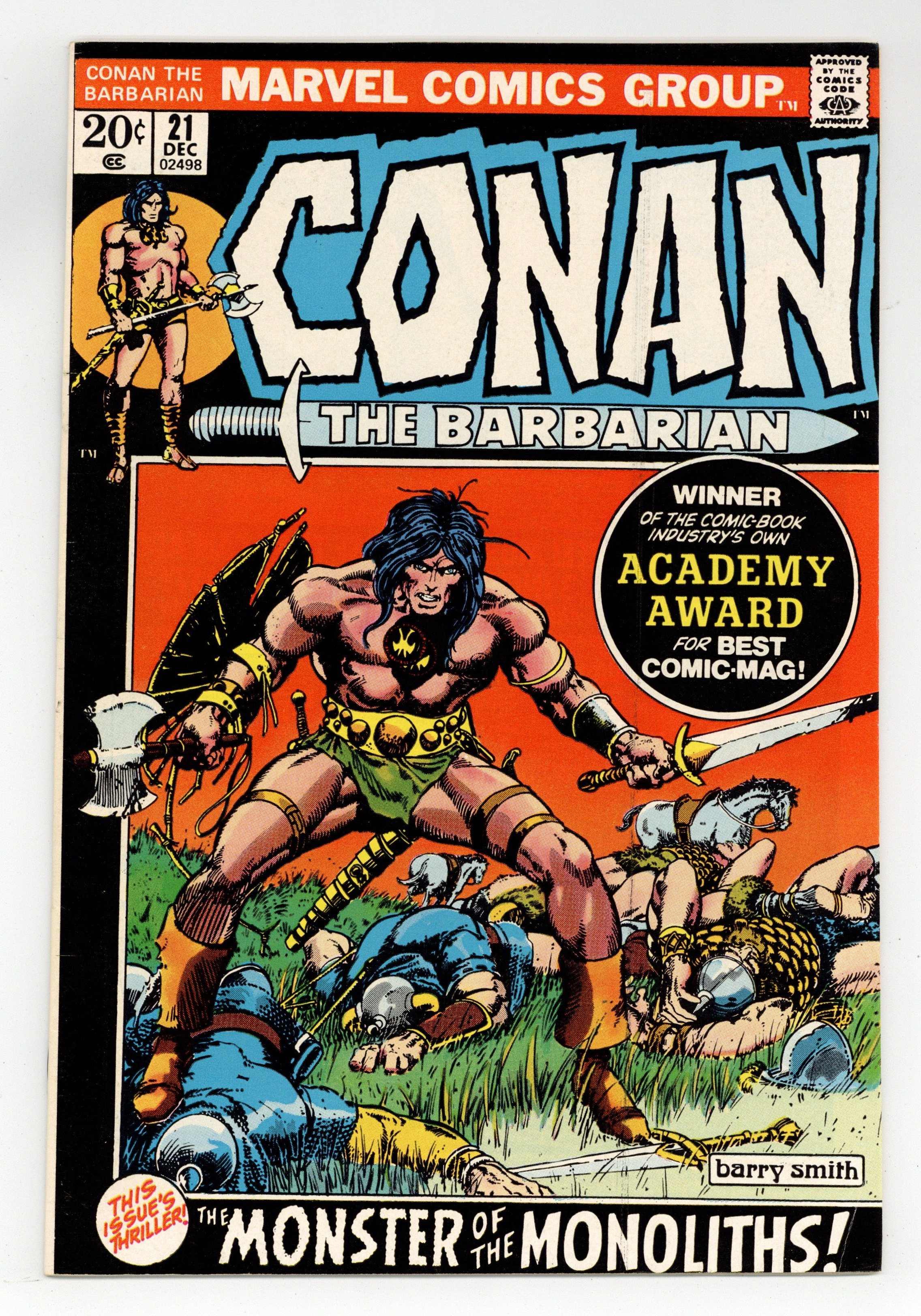 Starts Mar 23 Giant-size issue. Cover art by Barry Windsor-Smith. Giant-size issue. Rogues in the House starring Thak [an ape] (villain, introduction), Nabonidus, Igon, Jenna, and Murilo (introduction), script by Roy Thomas, pencils by Barry Windsor-Smith, inks by Sal Buscema; adapted from Rogues In the House by Robert E. Howard. Letter to the editor from cartoonist Fred Hembeck. Windsor-Smith cover. 52 pgs. Cover price: $0.25. Cover price $0.25.