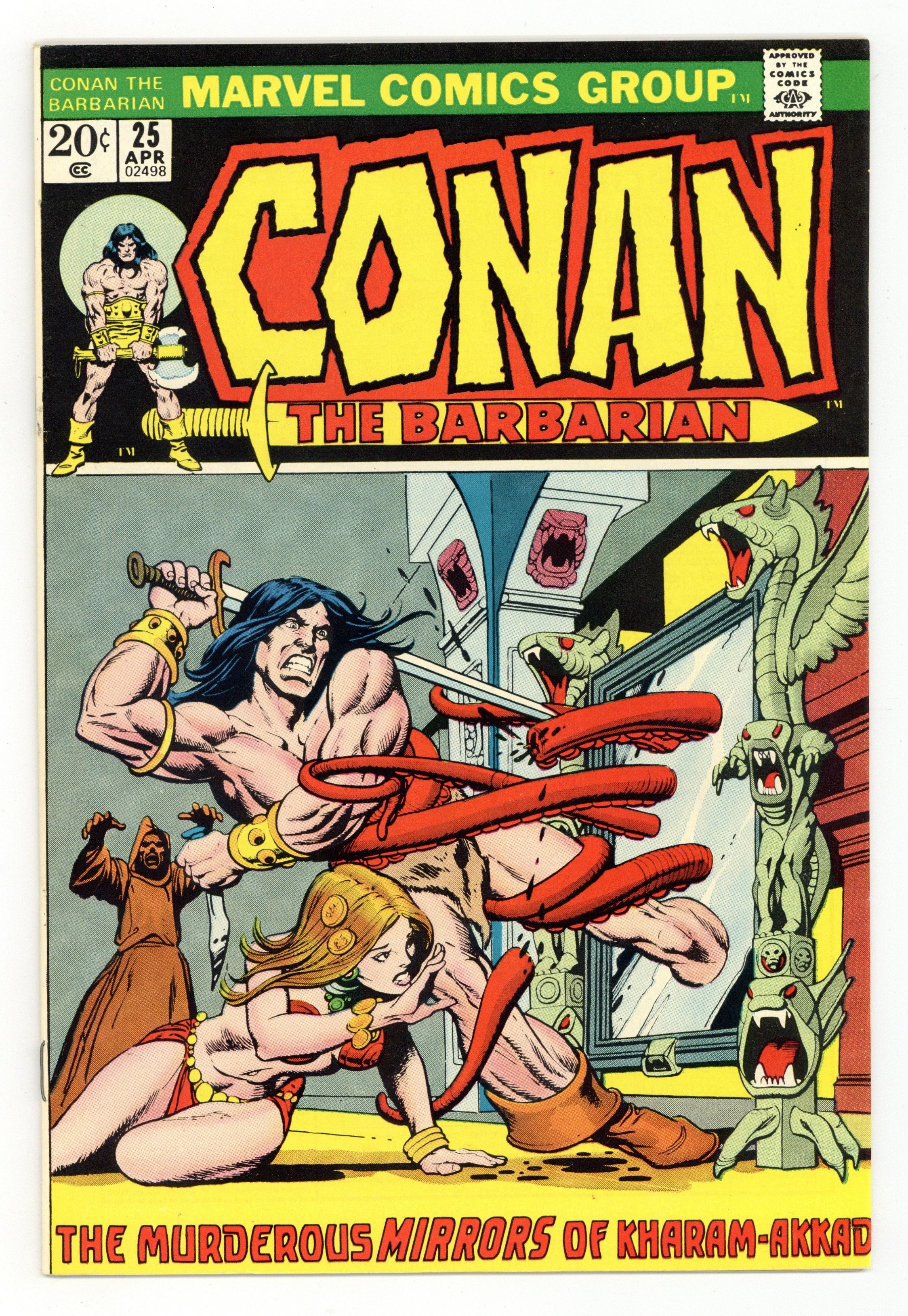 Starts Apr 20 Cover pencils by Ralph Reese (layout) and Gil Kane (finished art), inks by Ralph Reese. The Mirrors of Kharam-Akkad, script by Roy Thomas, co-plot by Barry Windsor-Smith, pencils by John Buscema, inks by Sal Buscema and John Severin (pages 4-5); setting: City of Makkalet; Two page Kull flashback; Akkad; Prince Yezdigerd prepares to storm Makkalet; guest appearances by Kull and Brule the Spear-Slayer; the Kull appearance is based on a Kull story, The Mirrors of Tuzun Thone," by Robert E. Howard. 36 pgs. Cover price $0.20. Cover price $0.20.