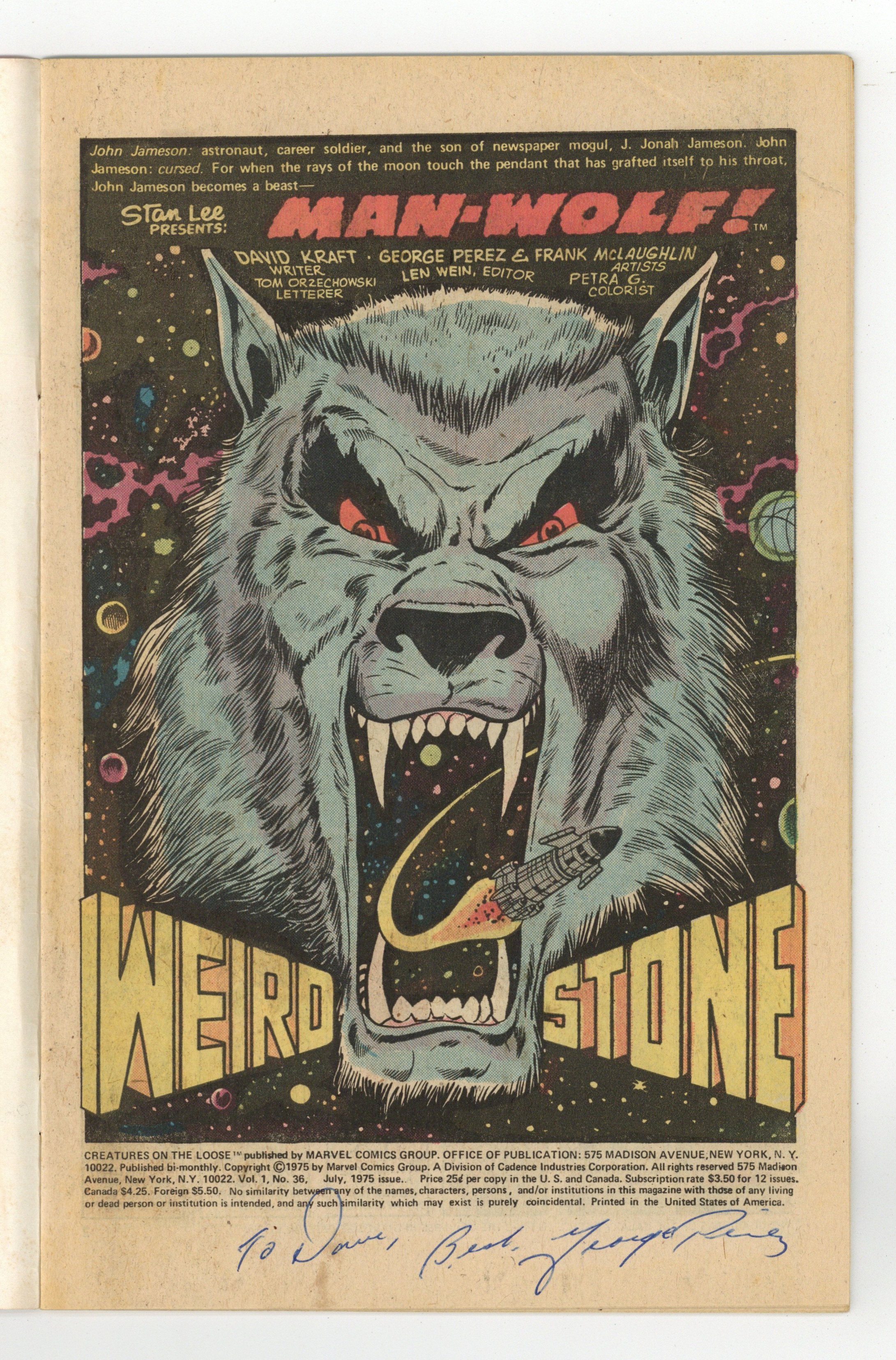 Starts Mar 23 Man-Wolf stars in "Weird Stone." Script by David Kraft, pencils by George Perez, inks by Frank McLaughlin. Appearances by Nick Fury and J. Jonah Jameson (from Spider-Man). Letter to the editor from comic writer Ralph Macchio. The letters page also also contains Marvel Value Stamp series A # 73 (Kingpin by John Romita Sr.). No reprint in this issue. Gil Kane/Klaus Janson cover. Cover price $0.25.