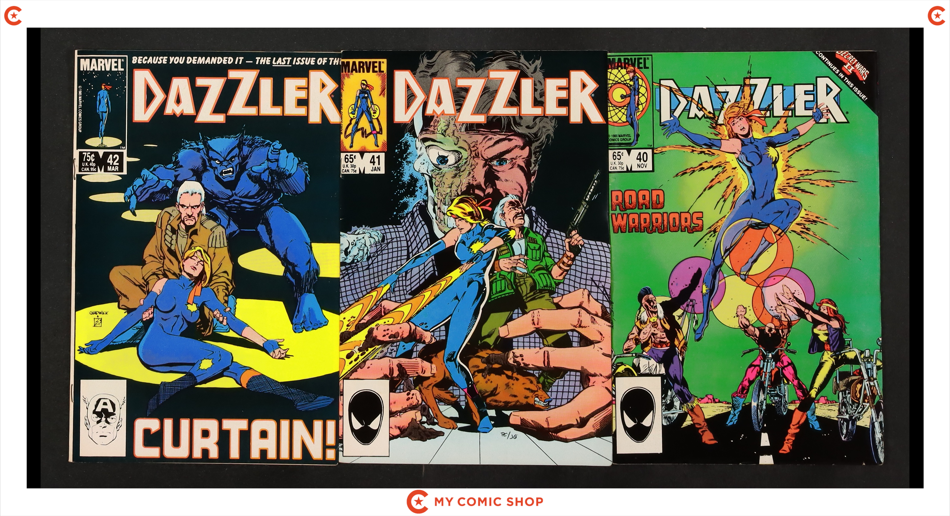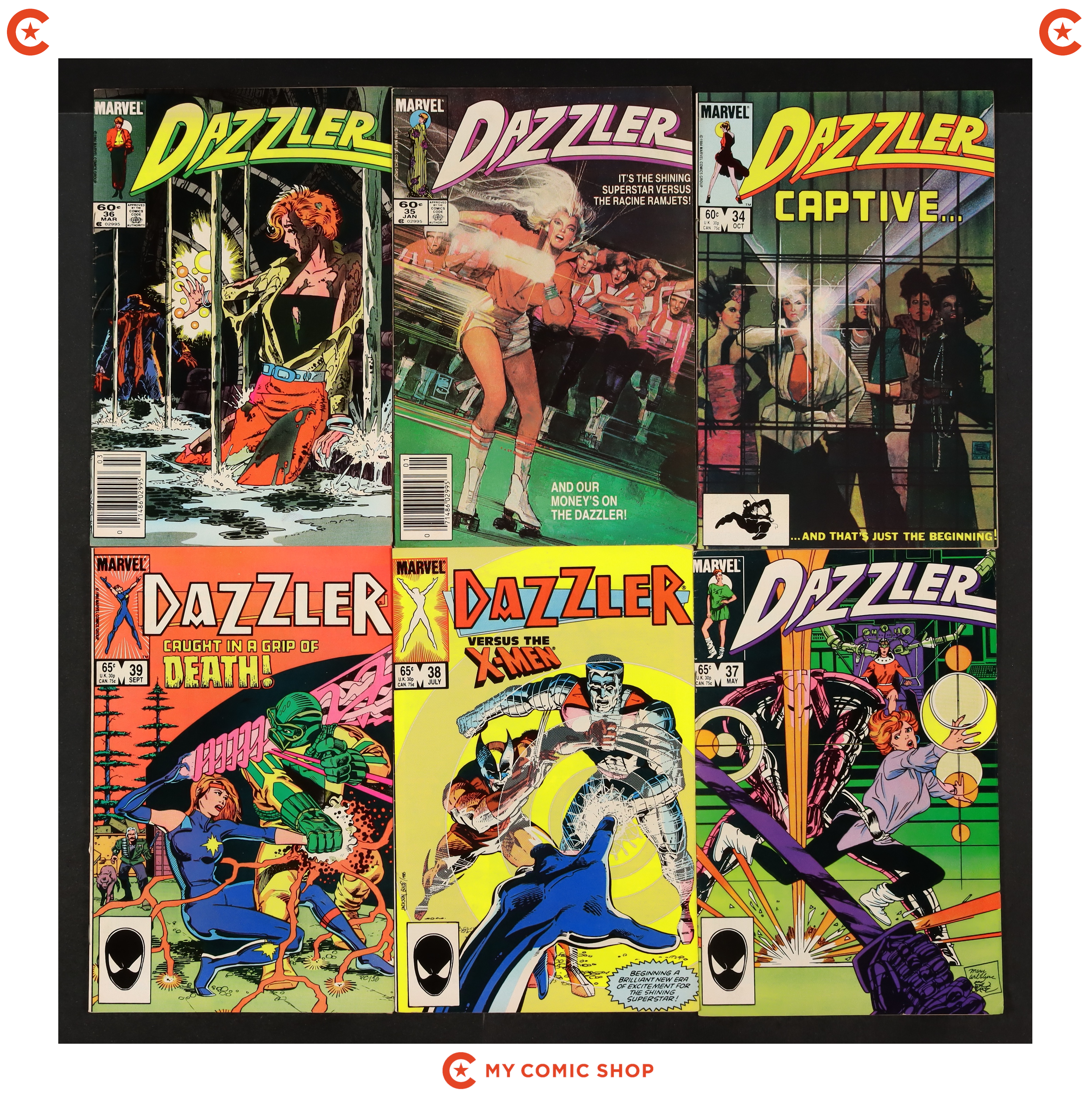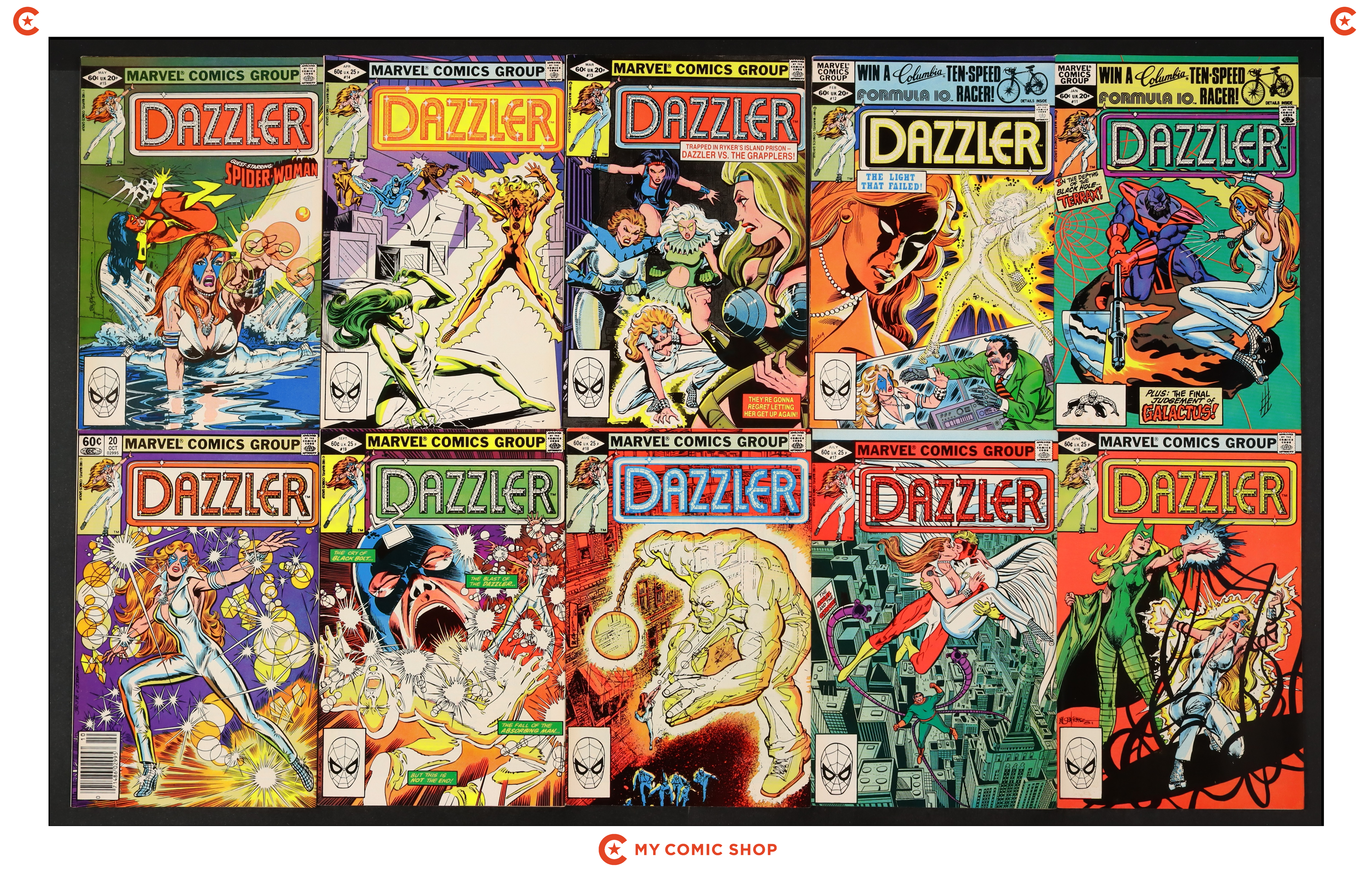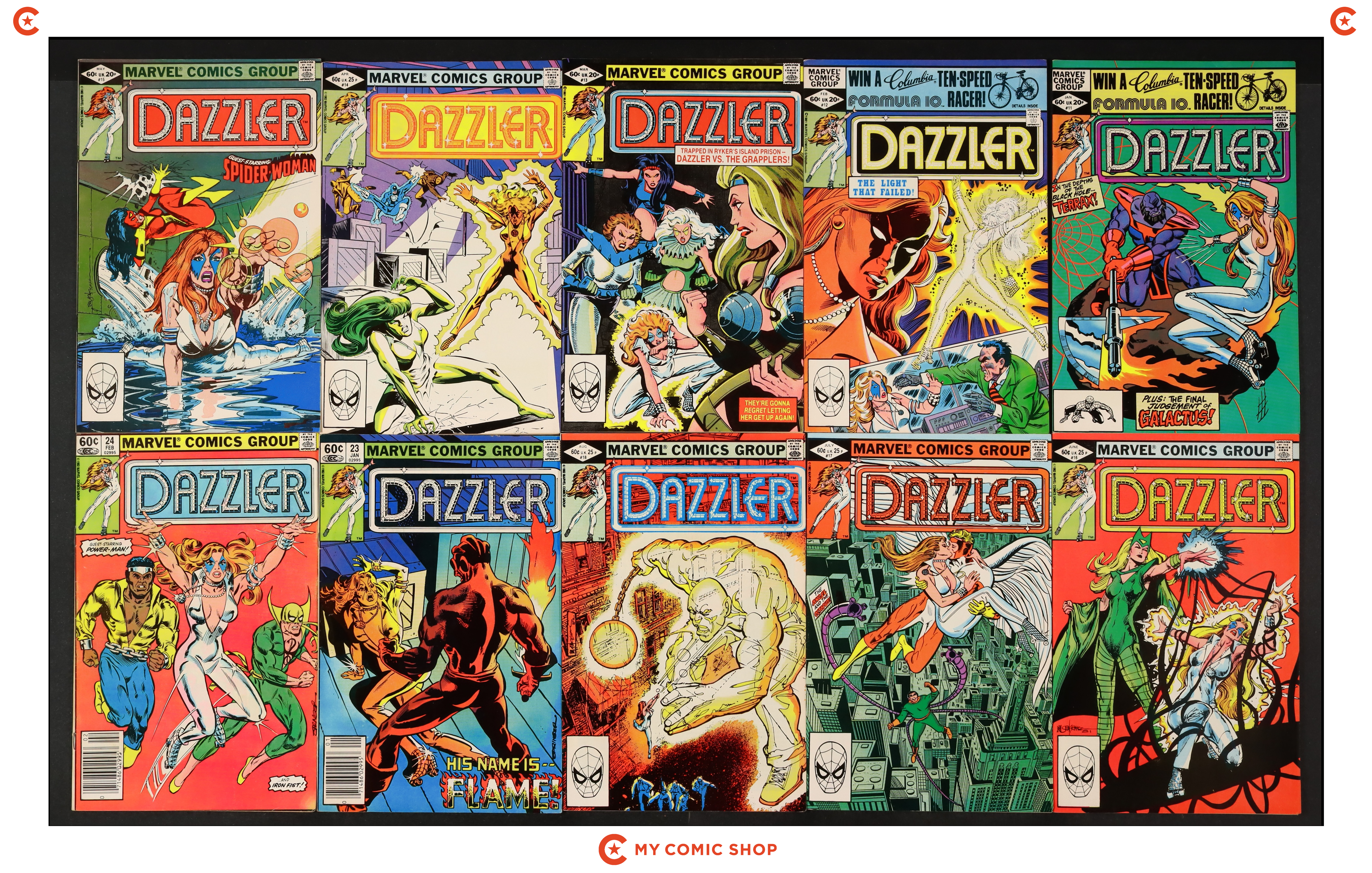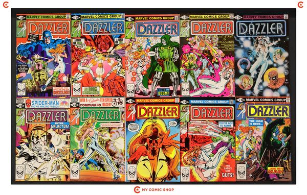 Issues 1Error, 2D, 3D, 4, 5, 6, 7D, 8D, 9, 10, 11, 12, 13, 14, 15, 16, 17, 18, 19, and 20 of Dazzler (1981). Most will grade in the FN to VF range.