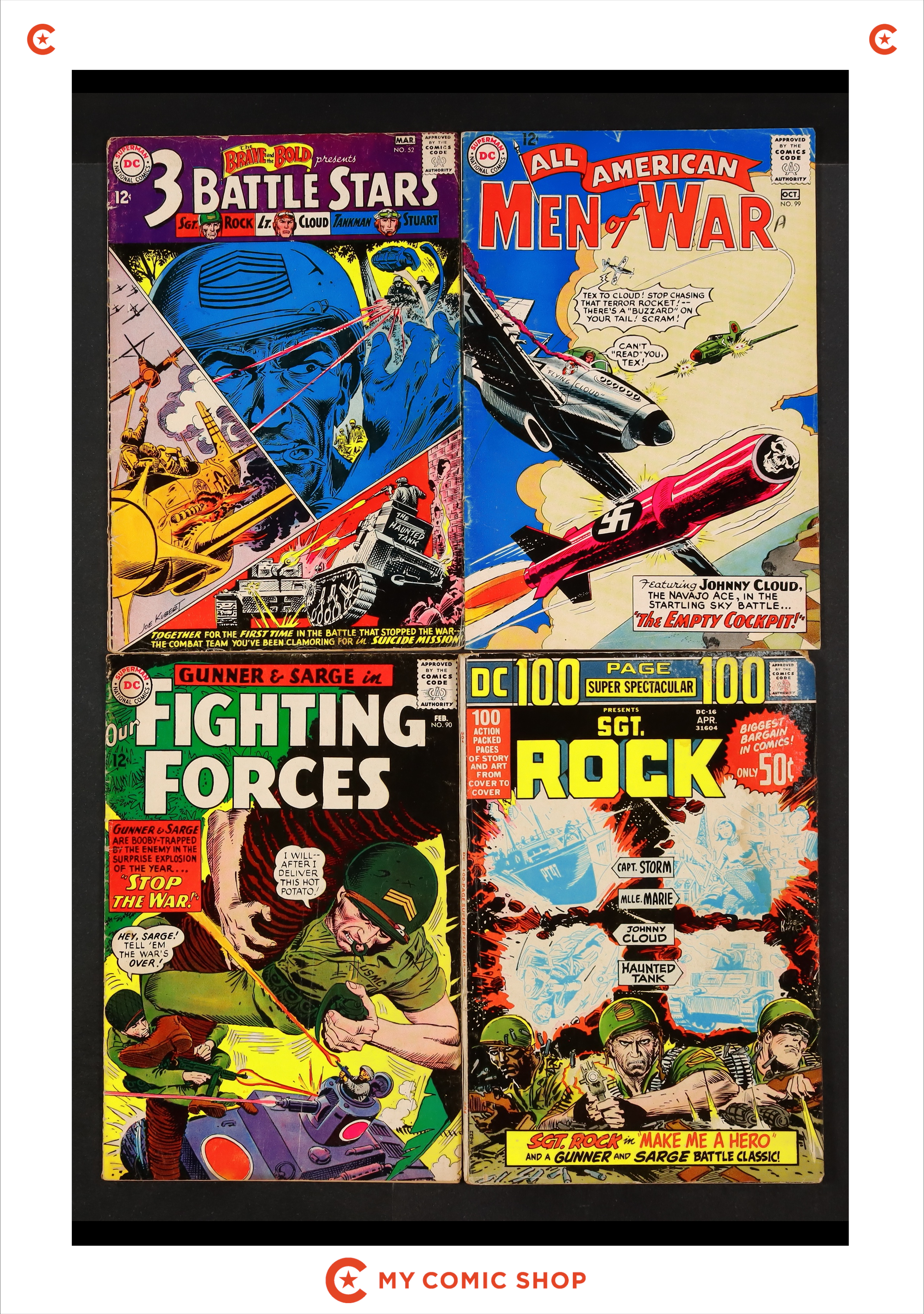 Issue 99 of All American Men of War (1952), issue 52 of Brave and the Bold (1955 1st Series DC), issue 16 of DC 100 Page Super Spectacular (1971), and issue 90 of Our Fighting Forces (1954). Most will grade in the FR to GD range.