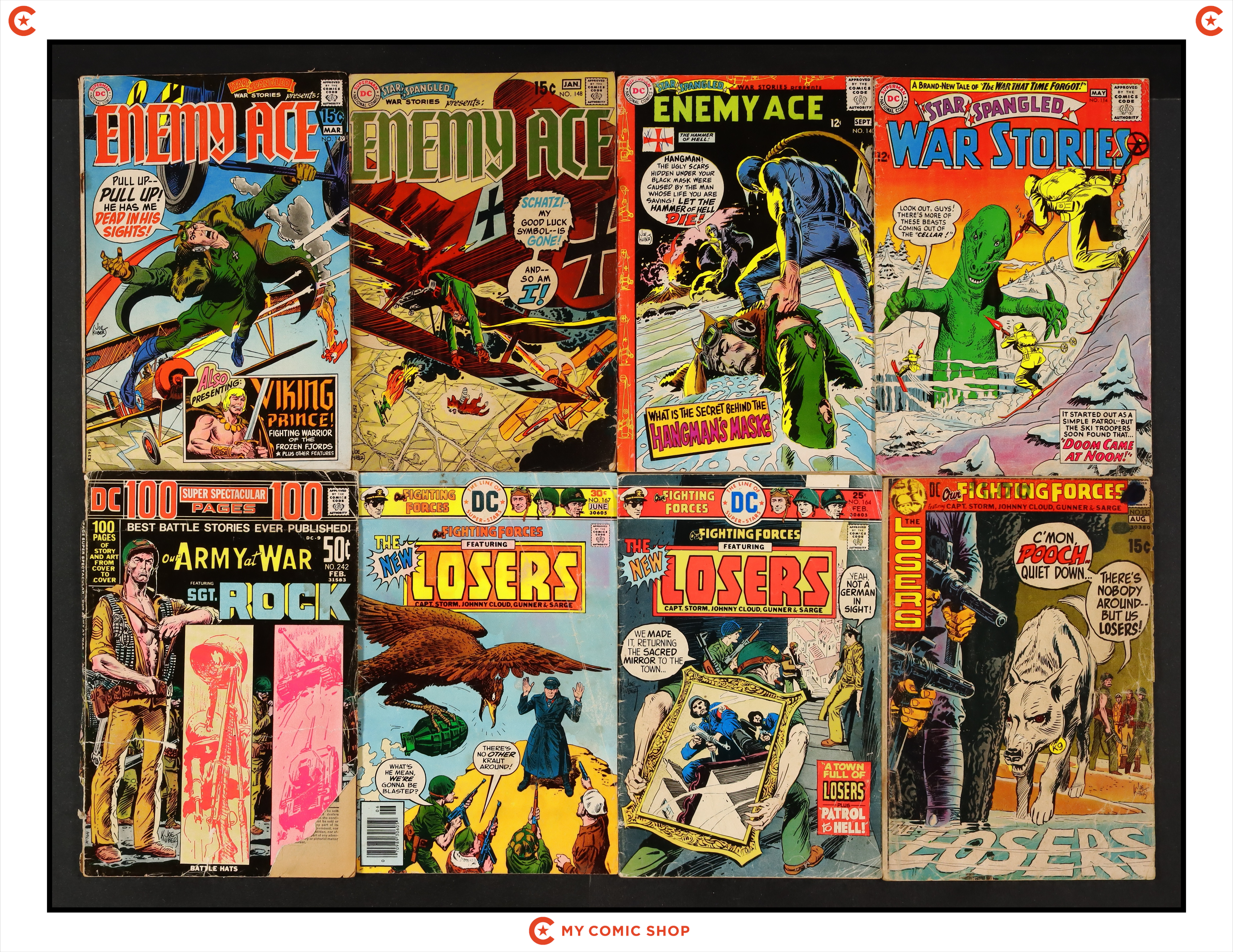 Issues 114, 140, 148, 149 of Star Spangled War Stories (1952 DC 2nd Series), issues 132, 164, 167 of Our Fighting Forces (1954), and issue 242 of Our Army at War (1952). Most will grade in the FR to GD range.