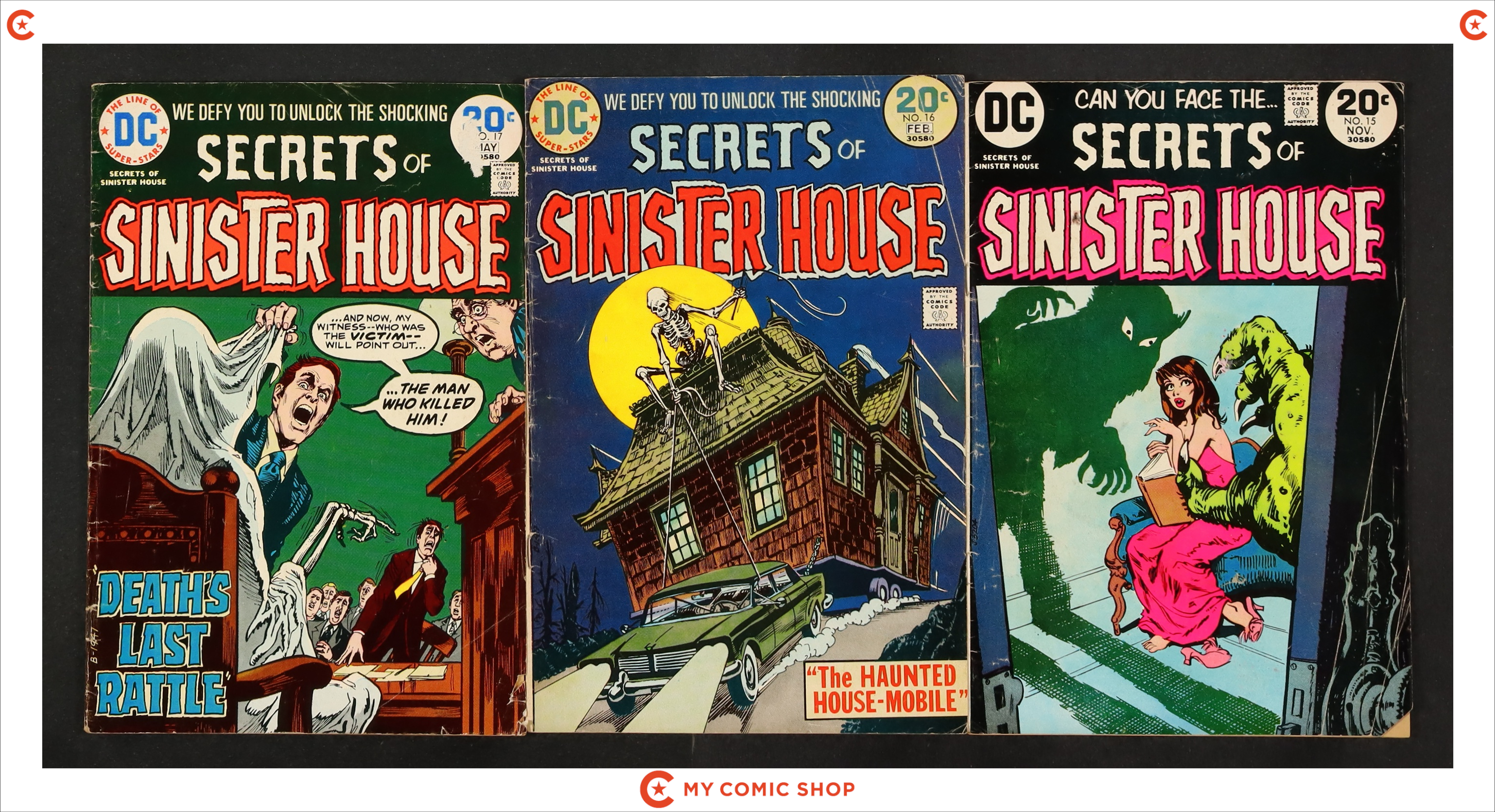 Issues 1, 3, 12, 43, and 44 of Secrets of Haunted House (1975); 5, 6, 8, 11, 13, 15, 16, and 17 of Secrets of Sinster House (1975). Most will grade in the FN to VG range with a couple grading GD.