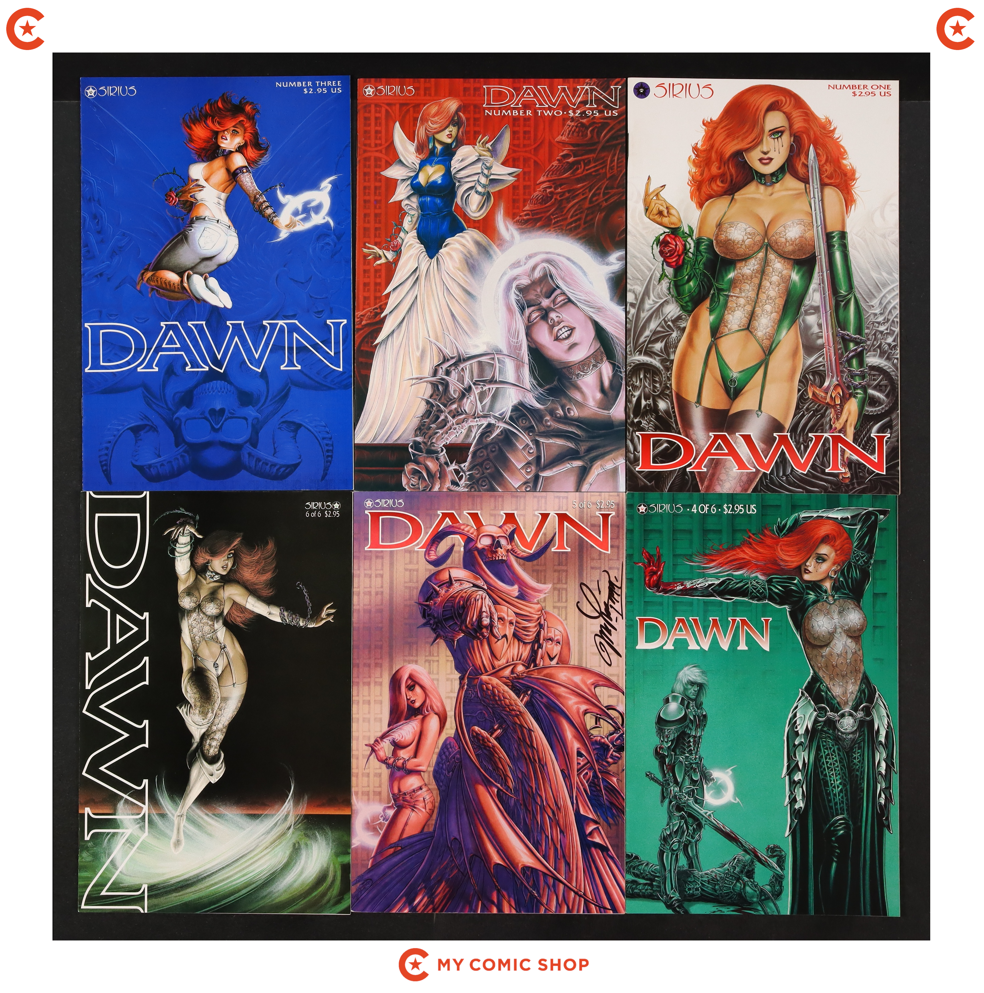 Issues 1A, 2A, 3A, 4A, 5, and 6 of Dawn (1995) with issue #5 signed by Joseph Michael Linsner. No autograph certification is included. Most will grade in the FN to VF range.
