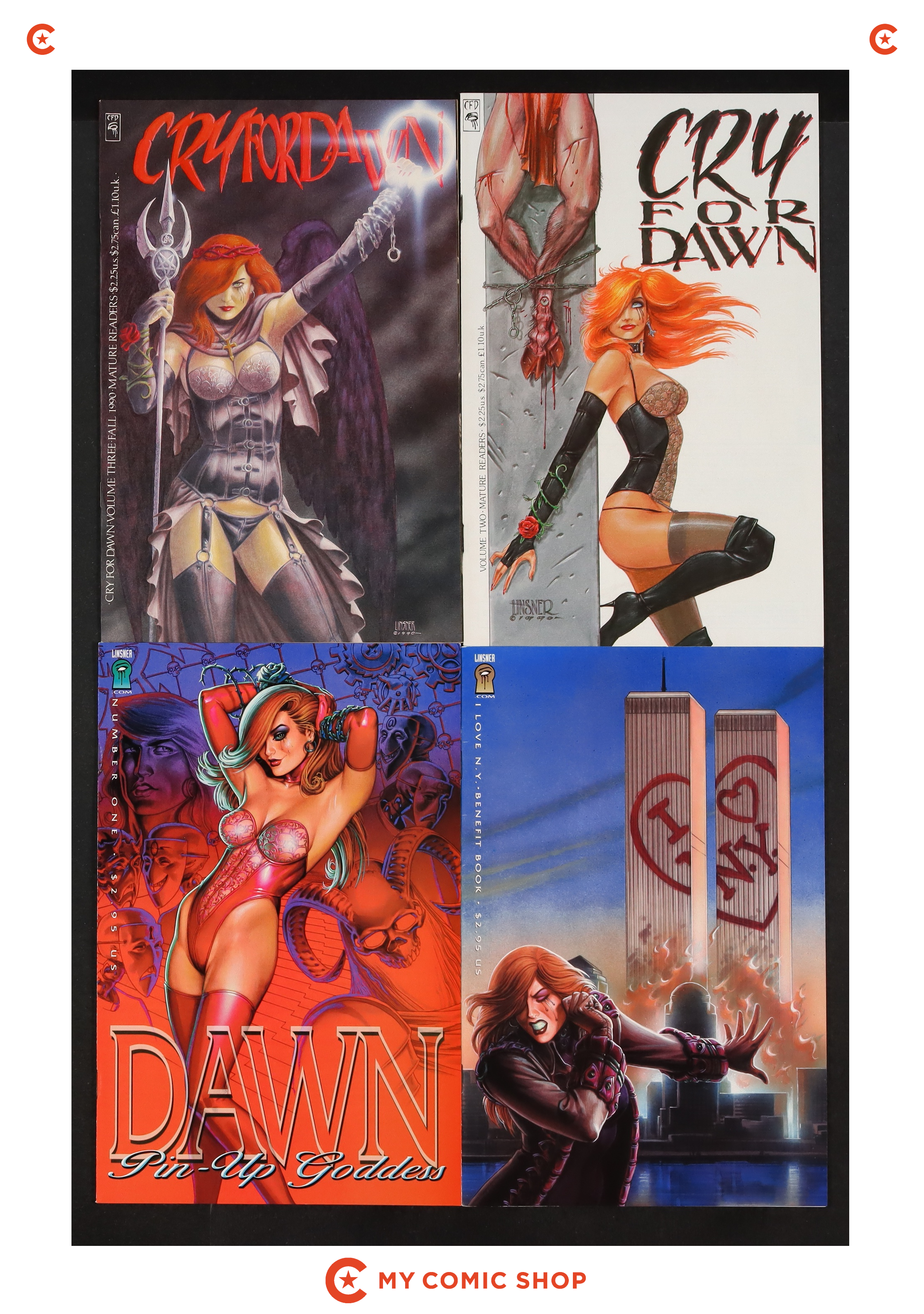 Issues 2A, 3 of Cry for Dawn (1989), issue 1 of I Love New York (2002), and issue 1A of Dawn Pin-Up Goddess (2001). Most will grade in the FN to VF range.