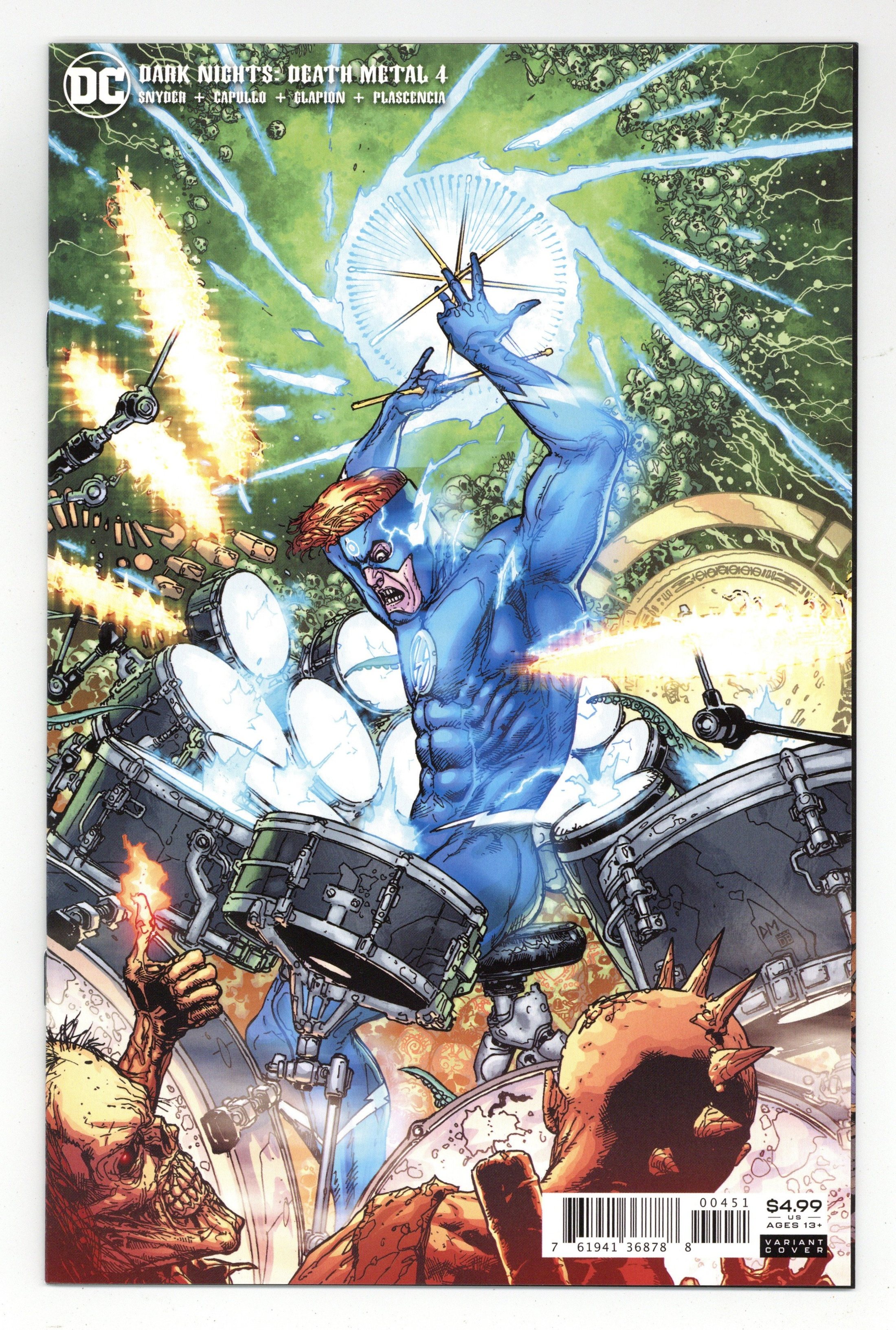 Starts May 4 Limited 1 for 25 Retailer Incentive Variant Cover. Written by Scott "Skull Crusher" Snyder. Art by Greg "Constrictor" Capullo, Yanick "Yell Master" Paquette, Bryan "Hatchet Man" Hitch, Jonathan "Gut Punch" Glapion, FCO "Plastique" Plascencia, Nathan "Fist of Steel" Fairbairn and Alex "Slicer" Sinclair. Cover by Doug "Malice" Mahnke and David "Bloodstorm" Baron. The song remains anything but the same as the house lights start to come up on DCs biggest, baddest battle for control of the Multiverse! The Darkest Knight is on the verge of ending this concert once and for all, but Wonder Woman has more than just a greatest hit planned. The Amazonian warrior stands ready to shred the Darkest Knight, solo! Plus, this extra-sized finale issue includes not one but two mind-blowing epilogues that lead directly into the next phase of the DC Universe—and no fan will want to miss that! 48 pages, full color. Ages 13+ Cover price $5.99.