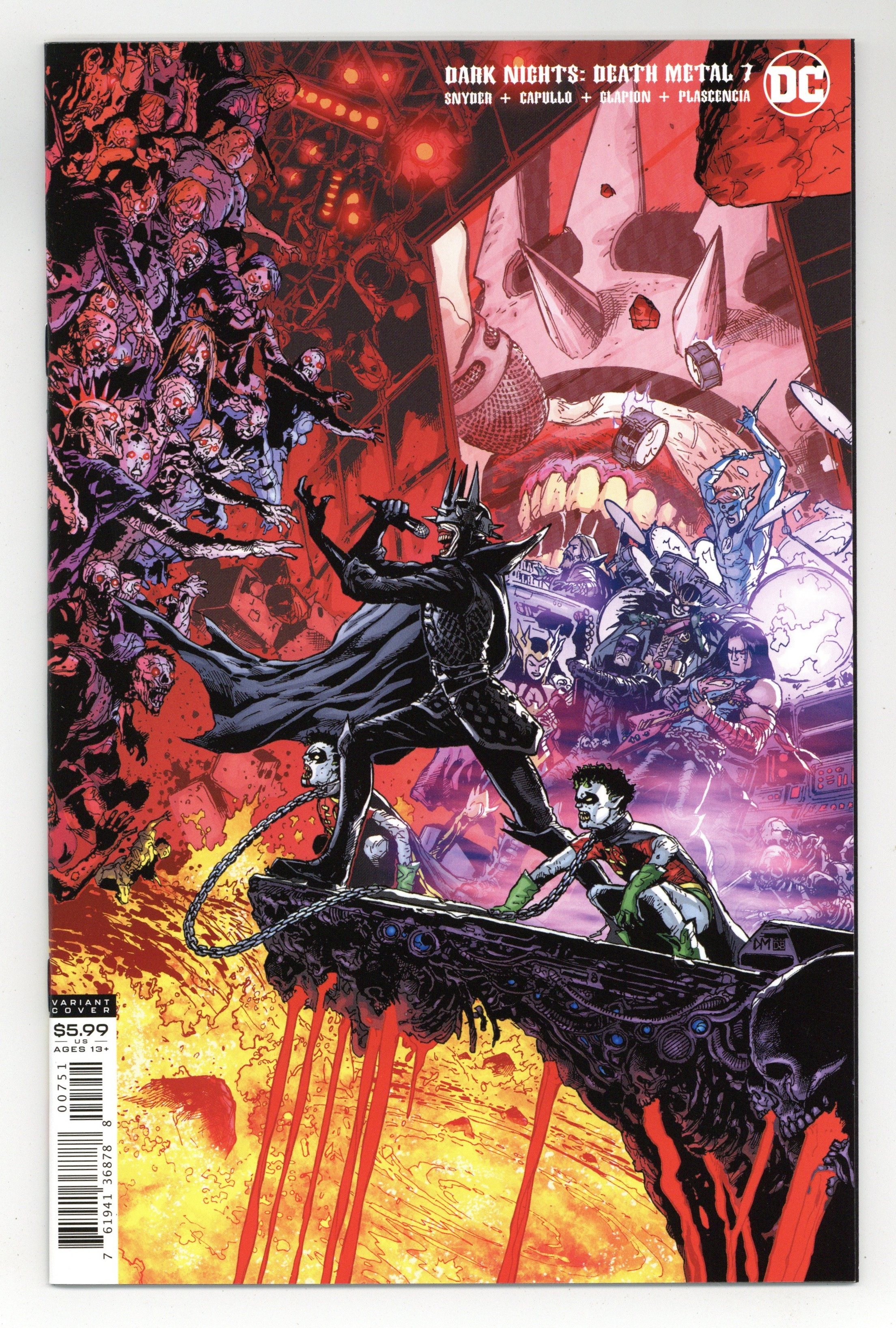 Starts May 4 Limited 1 for 25 Retailer Incentive Variant Cover. (W) Scott Snyder (A) Greg Capullo, Jonathan Glapion (CA) Doug Mahnke The battle rages as the entire DC Universe stands against the Darkest Knight! Villains fight alongside heroes working as one to banish this demon from the deepest corners of the Dark Multiverse. Meanwhile, the Robin King lurks nearby, his army of Groblins in wait. The dogs of war are loose and no one is safe. 32 pages, full color. Rated T+ Cover price $4.99.
