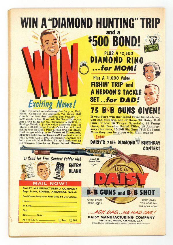 Starts Apr 4 Cover pencils by Carmine Infantino, inks by Joe Giella. First appearance of Captain Boomerang in Here Comes Captain Boomerang!, script by John Broome, pencils by Carmine Infantino, inks by Murphy Anderson; W.W. Wiggins, the head of a game company, hires Digger Harkness to be his boomerang expert; Harkness becomes Captain Boomerang, commits crimes, and battles Flash. The Madcap Inventors of Central City!, script by Gardner Fox, pencils by Carmine Infantino, inks by Joe Giella; Winky, Blinky, and Noddy build a machine and start an inventing business. Letter to the editor from Fox himself! Ad for Giant Superman Annual. Comparative Speed Records fact page. Training Secrets Manual ad featuring Bob Cousy, Doak Walker, Carmen Basilio, and Kyle Rote. 36 Pages, Full Color. Cover price $0.10.