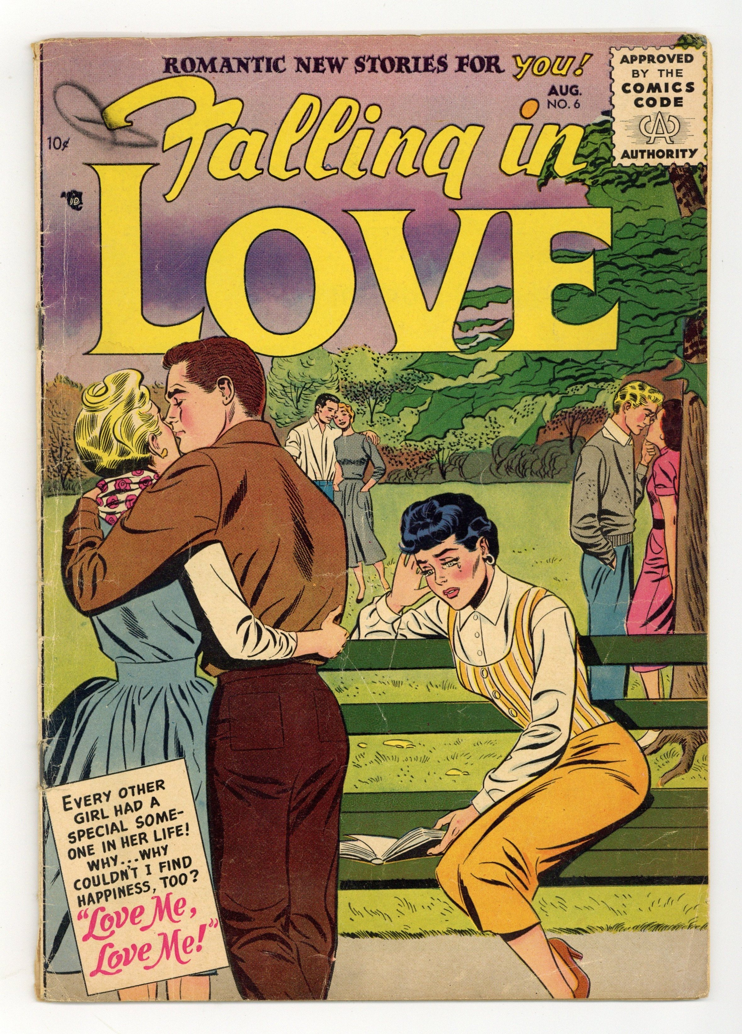 Starts Apr 4 Every other girl had a special someone in her life -- why couldn't she find happiness, too? Featuring: 8 page story "Love Me, Love Me!" (cover art taken from splash page of this story). Plus: 7 page story "A Place In His Heart"; 2 page A Woman to Remember filler "Anne Dacier" (scenes from the life of French translator Anne Dacier); 7 page story "Other Loves"; 6 page story "Too Wonderful to Last!"; 2 page To You...From Carol Andrews letters page. Cover price $0.10.