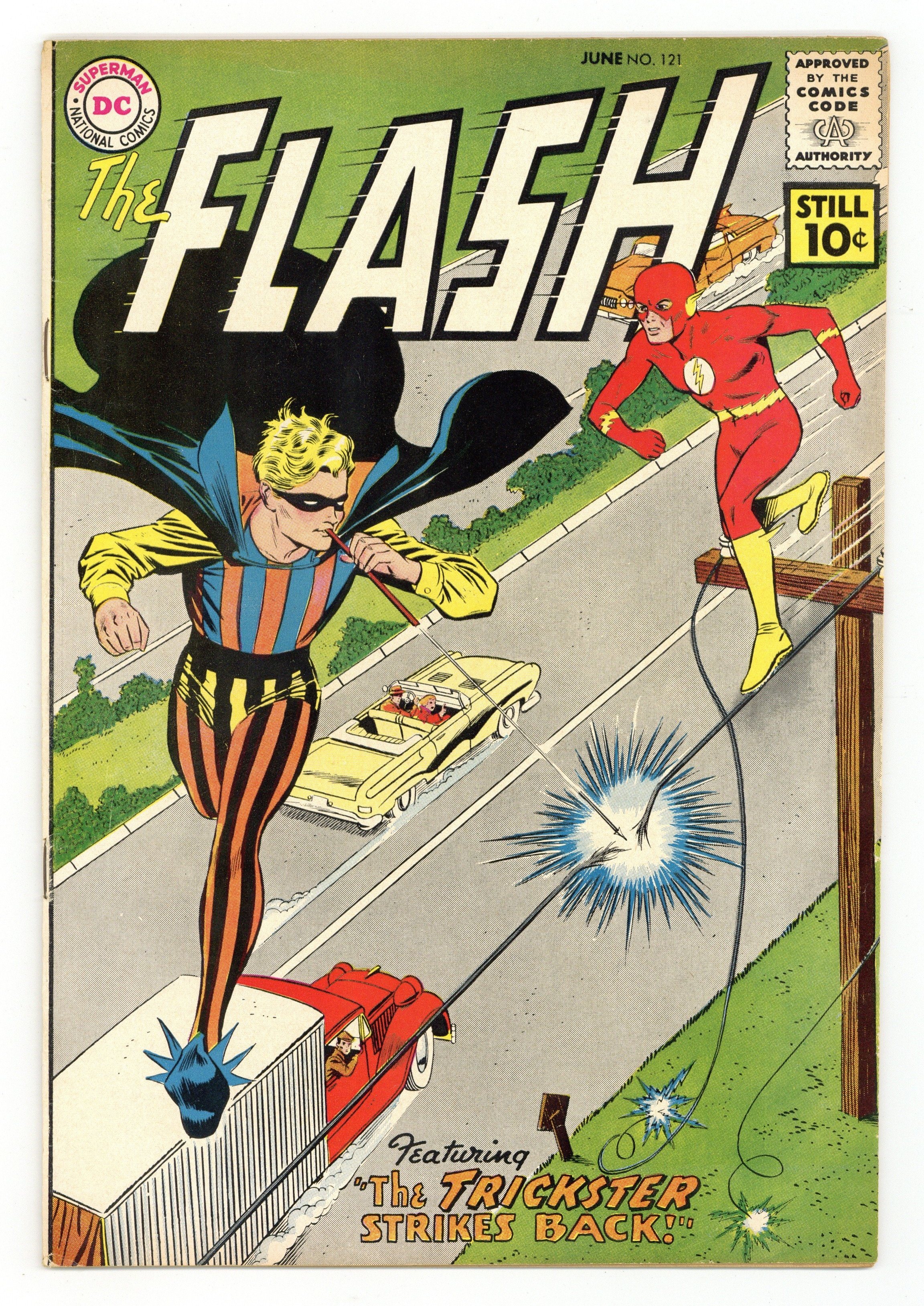 Starts Apr 4 Cover pencils by Carmine Infantino, inks by Joe Giella. Origin and 1st appearance of the Trickster in Danger in the Art, pencils by Carmine Infantino, inks by Joe Giella; Flash battles the Trickster, who escapes by running on air. The Man Who Claimed the Earth!, script by John Broome, pencils by Carmine Infantino, inks by Joe Giella; Iris and Dr. Wiley research some strange metal, which is wreckage from a spaceship; Flash battles Po-Siden. Palisades Amusement Park ad with Superman. National Sports council book ad with Mickey Mantle and Joe Louis. 36 Pages, Full Color. Cover price $0.10.