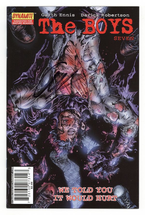 Ends Jan 26 7:46 PM CST Bid History 3 bids Current Bid $8 Your Secret Max Bid If you'd like to bid, please log in or register. Dynamite Reprint Edition. Written by Garth Ennis. Art and Cover by Darick Robertson. Need the perfect jumping-on point for The Boys after binging it on Prime? Here you go! Dynamite never actually had the honor of publishing issue #1 of The Boys (we started with #7), but now we're doing it here as a special, limited edition. Don't miss out on where it all began! 32 pages, full color. Mature Readers. NOTE: Do not confuse with the 2006 Wildstorm printing. Cover price $4.99.