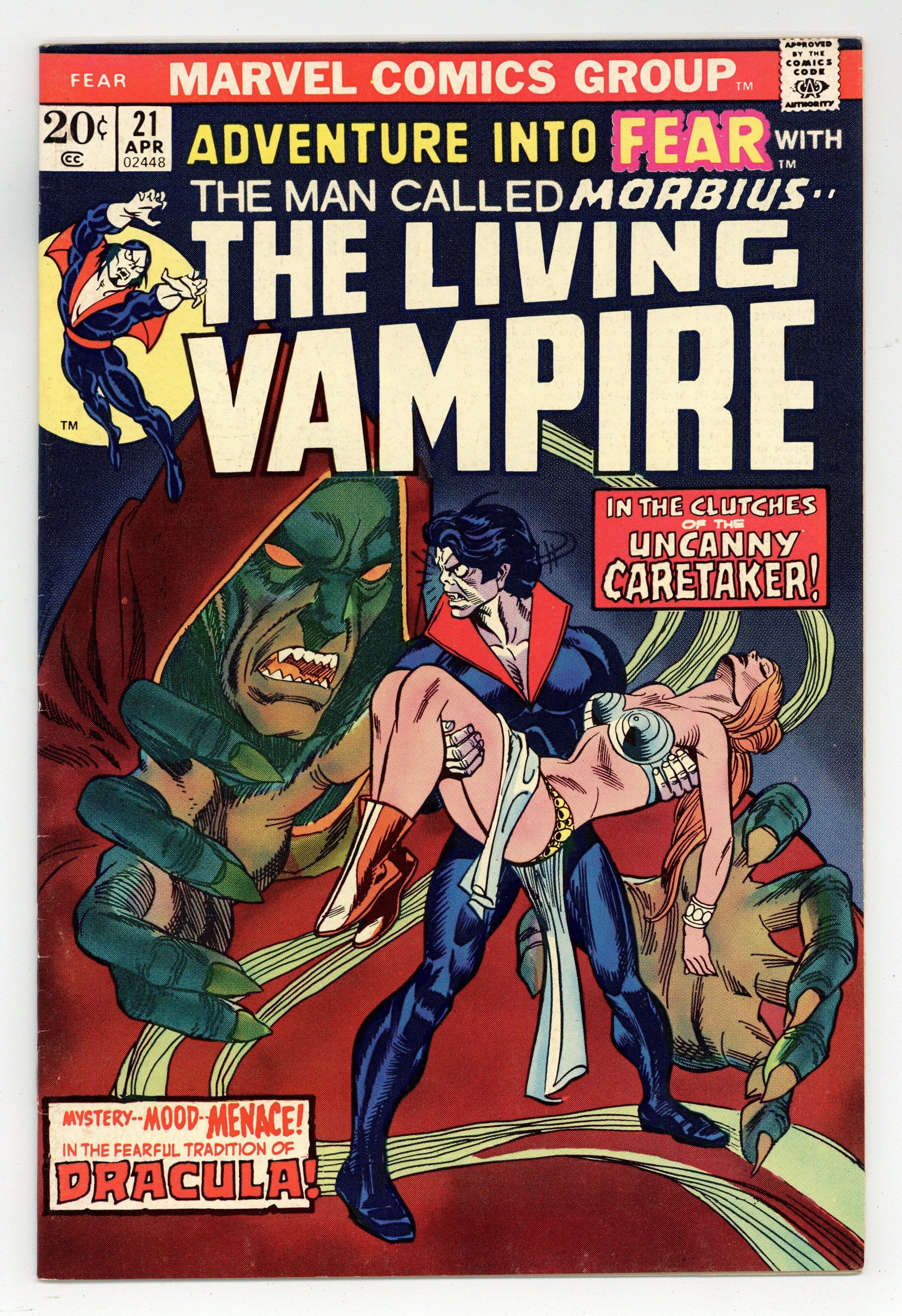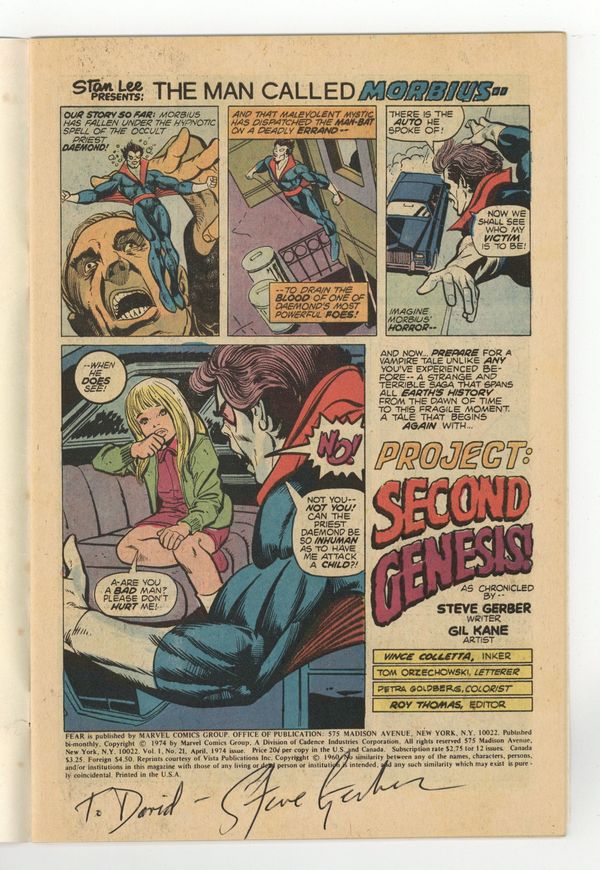 Starts Mar 23 Last 20-cent cover price. Morbius stars in "Project: Second Genesis!" Script by Steve Gerber, pencils by Gil Kane, inks by Vince Colletta. Reprint back-up story: "Sorry, Mr. Hopkins!" The letters page contains Marvel Value Stamp series A # 77 (the Swordsman by Gene Colan). Gil Kane cover. Cover price $0.20.