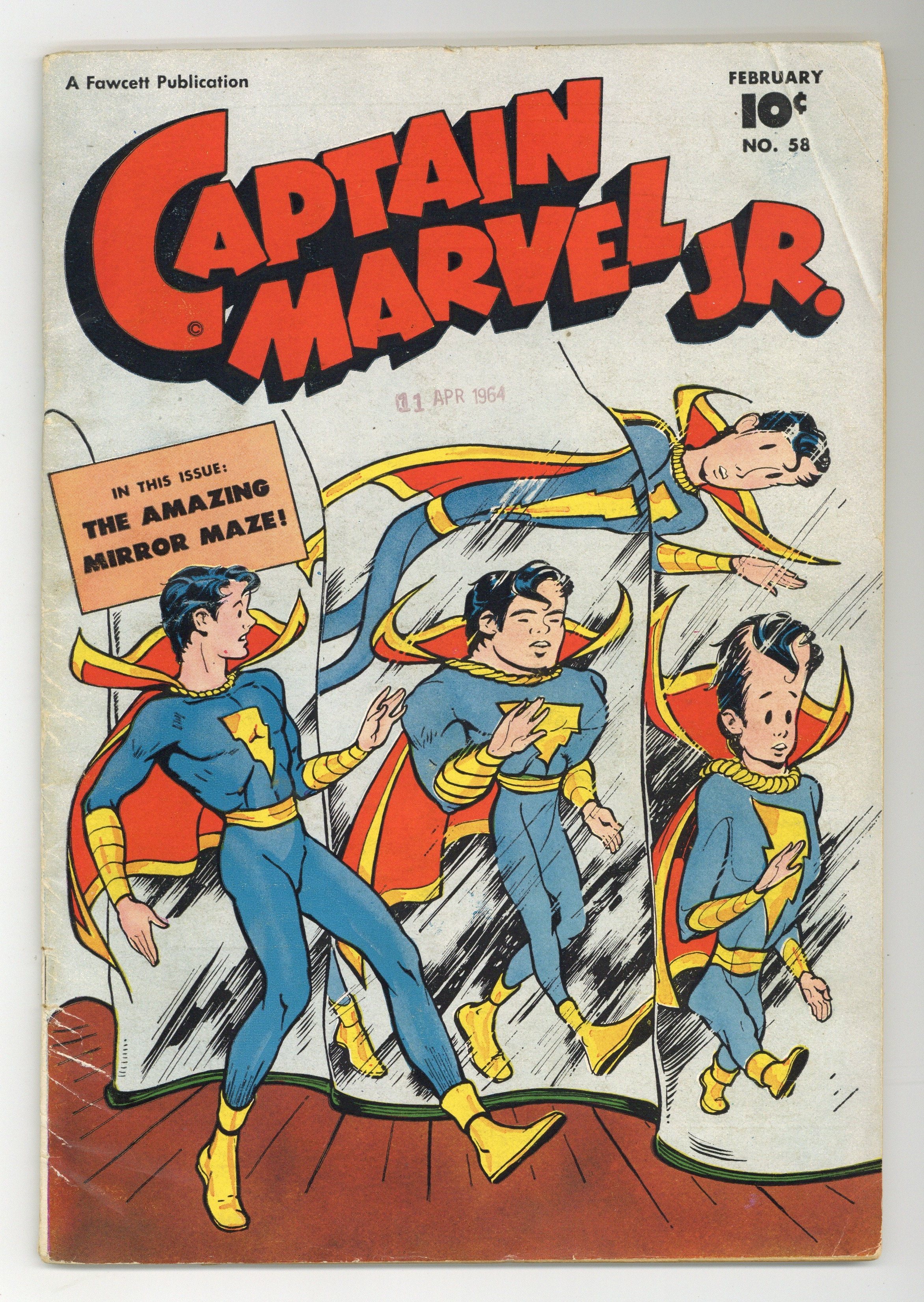 Starts Jan 26 Cover by Bud Thompson. Stories by Otto Binder, Sid Lazarus, Art Helfant¸ and Bill Woolfolk. Art by Kurt Schaffenberger, Joe Certa¸ Sid Lazarus, and Art Helfant. Superhero action with Freddy Freeman, who gains the same powers as his hero Captain Marvel, better known these days as Shazam. Disgraced ex-jockey Sneaker Bleeker finds a rogue Pegasus, and suddenly he has the means for revenge against the horse-racing industry. The smartest boy in the world visits town, and immediately gets into the sort of trouble that only Captain Marvel Jr. can get him out of. Marvel Jr. seeks jewel thieves who hide out in a hall of mirrors, in a story with art by Kurt Schaffenberger. The Flying Horse; Boxcar Benny; Rubbernose Randolph; Homer the Mental Miracle; It's All Done with Mirrors; Car Capers / Bus Buffoonery; Snortville Sneeze: The Big Report; The Other Passenger; Kanvasback Takes a Cuffing; The Metal Island. 48 pages, Full Color. Cover price $0.10.