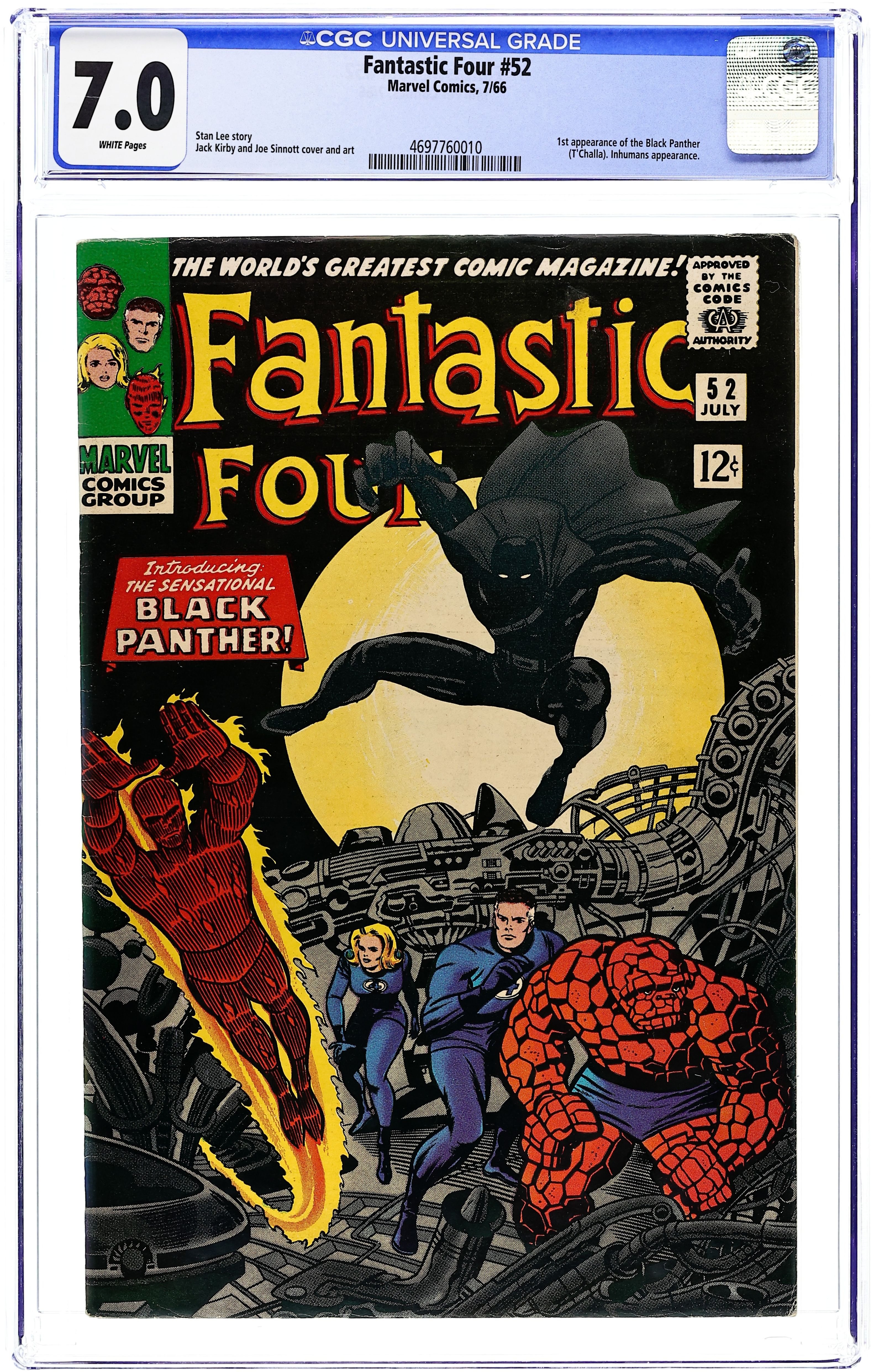 Starts Apr 4 Cover pencils by Jack Kirby, inks by Joe Sinnott. First appearance of the Black Panther in The Black Panther!, script by Stan Lee, pencils by Jack Kirby, inks by Joe Sinnott; The Black Panther invites the FF to Wakanda and demonstrates his powers by attacking them. 36 pgs. Cover price $0.12.