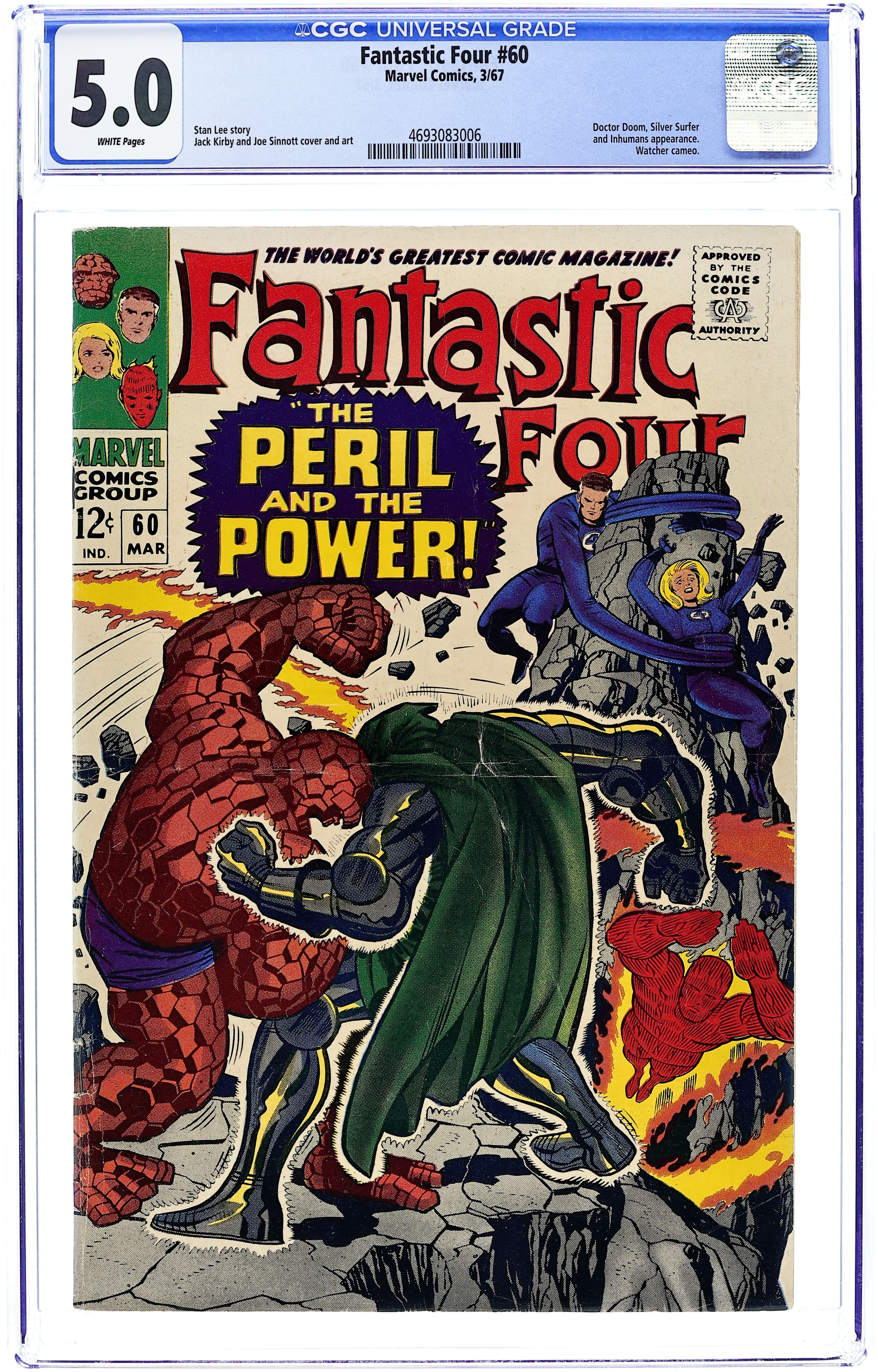 Starts Apr 4 Cover pencils by Jack Kirby, inks by Joe Sinnott. Doctor Doom steals the Silver Surfer's cosmic powers (part 4 of 4) in The Peril and the Power!, script by Stan Lee and Jack Kirby (co-plot), pencils by Jack Kirby, inks by Joe Sinnott; The FF defeat Dr. Doom. Appearances by the Inhumans, the Watcher, and the Black Panther. 36 pgs. $0.12. Cover price $0.12.